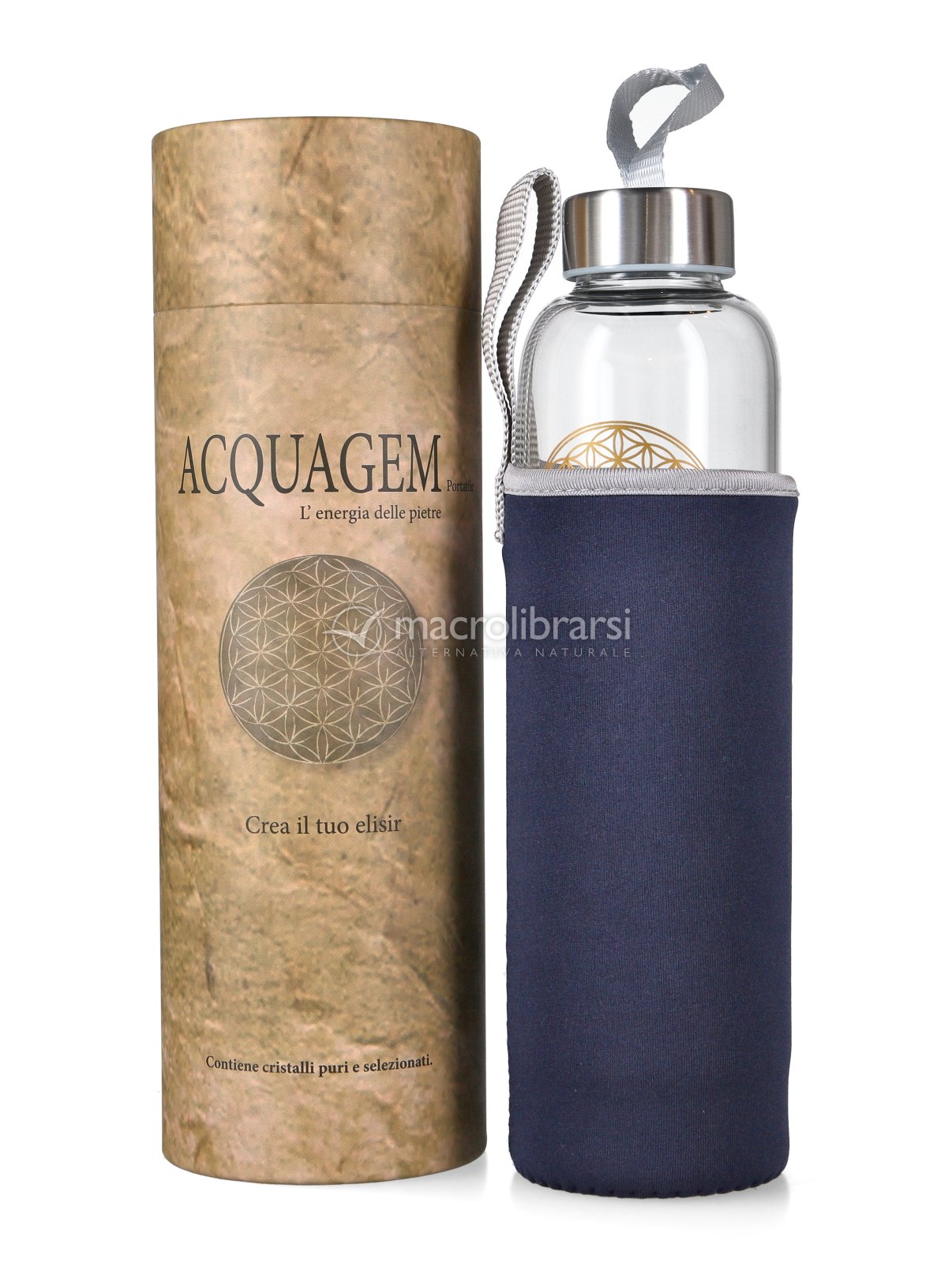Grazie a macrolibrarsi per questa bottiglia in cristallo con doppio fondo per riporvi cristalli per elisir. Ottimo prodotto e ottimo materiale. Provvista anche di custodia protettiva in neoprene e impreziosita dal fiore della vita stampato sul vetro che aggiunge la sua energia a quella dei cristalli. Prodotto consigliatissimo
