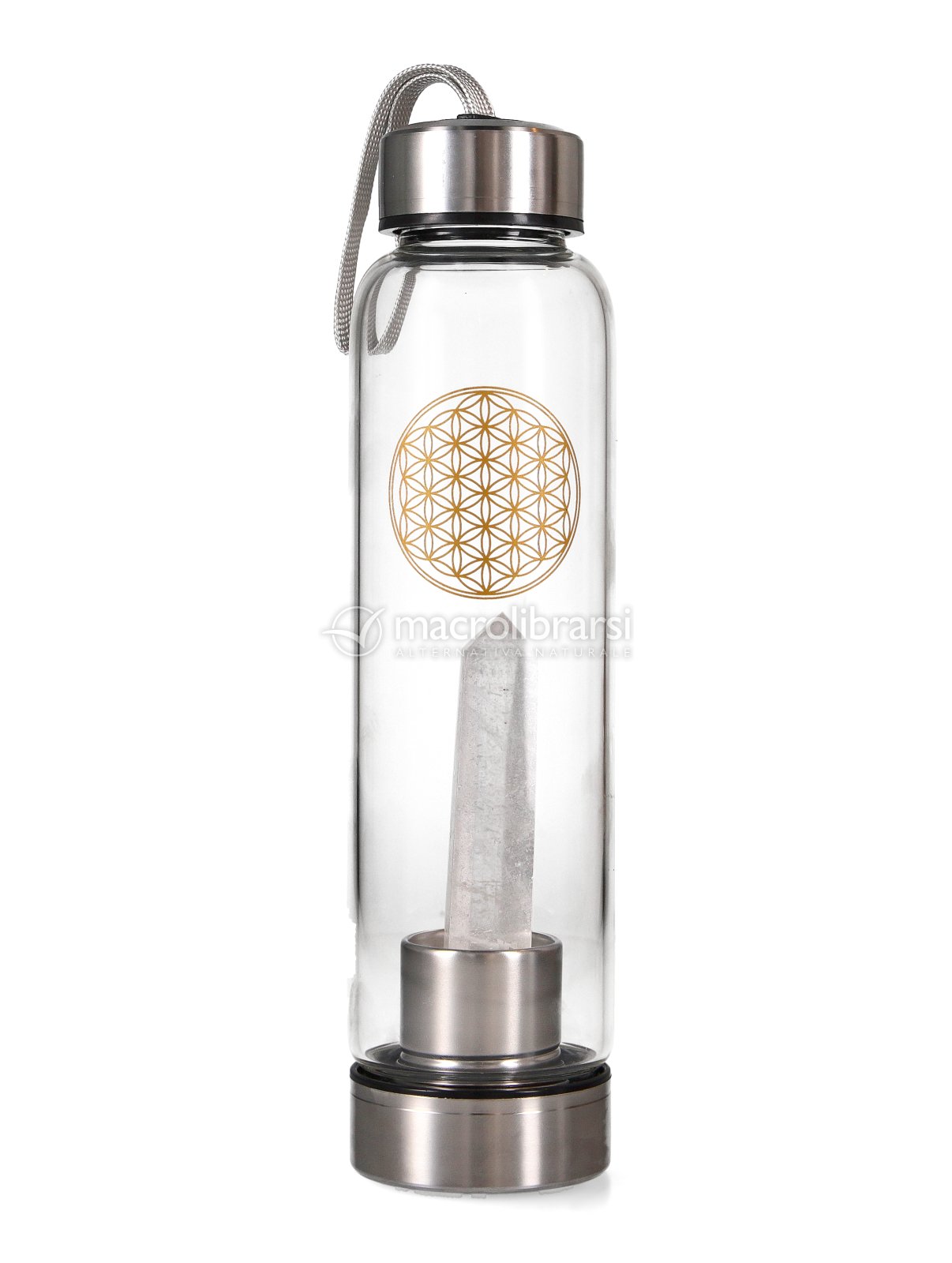 Acquagem – Bottiglia in Vetro con Punta in Cristallo di Rocca. Energizza la tua bevanda con l’intento dei cristalli, in modo pratico ed elegante.