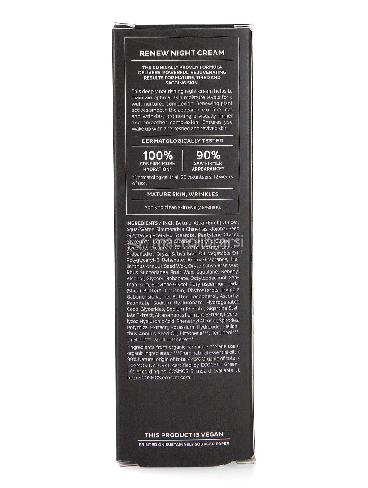 Formulata con micro e macroalghe marine rassodanti, fitosteroli vegetali e acqua di betulla del Nord, che ha dimostrato di accelerare la divisione cellulare dermica fino al 25%, questa crema notte certificata Cosmos Natural è il trattamento ideale per la pelle matura, secca e stanca, che al mattino mostrerà un aspetto totalmente rinnovato.