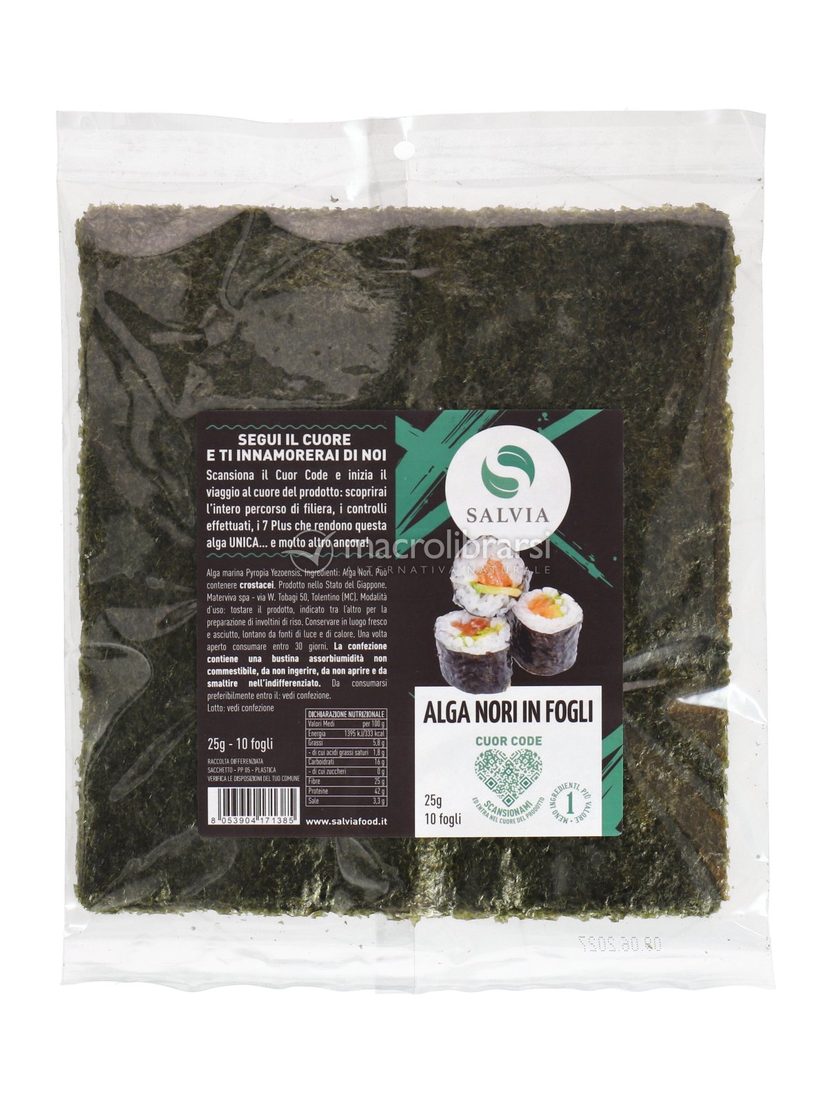 A differenza di molte altre alghe Nori disponibili sul mercato, quella di Salvia è semplicemente essiccata in sottili fogli, senza ulteriori trattamenti: in questo modo mantiene intatti la freschezza, il sapore e il profilo nutrizionale.