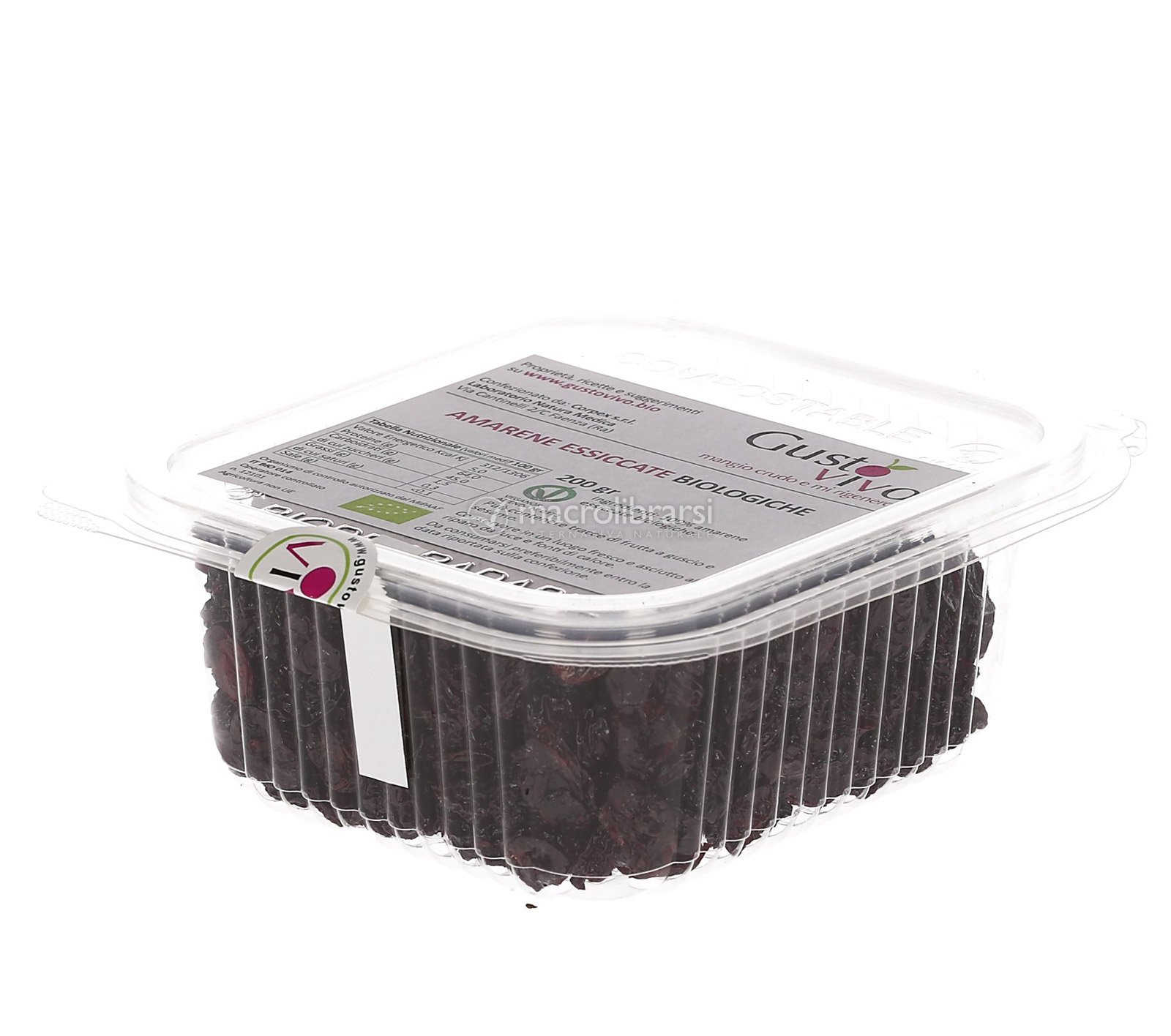 Amarene essiccate, crude e biologiche pronte per essere aggiunte a qualsiasi preparazione. Questa azienda è fantastica perché utilizza vaschette in “plastica” vegetale che può essere buttata nei rifiuti organici. Perfetto!