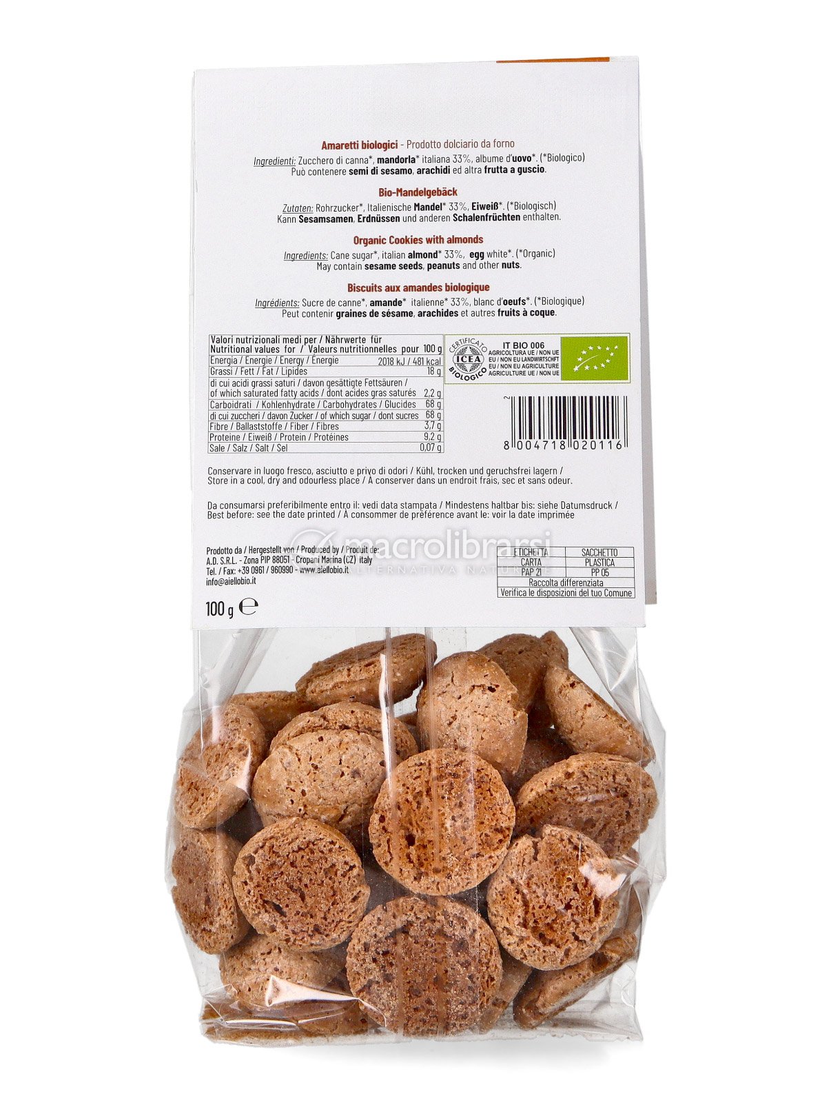 Ispirati ad un’antica ricetta siciliana, da qui proposti nella variante “dura”, gli “Amaretti” arricchiscono la linea della biscotteria tipica italiana. Contengono il 33% di mandorla e sono completamente privi di aromi aggiunti, in quanto il gusto tipico dell’Amaretto viene ottenuto dall’aggiunta di mandorla amara, anche questa rigorosamente biologica e, nel rispetto dell’antica ricetta, sono privi di farina.