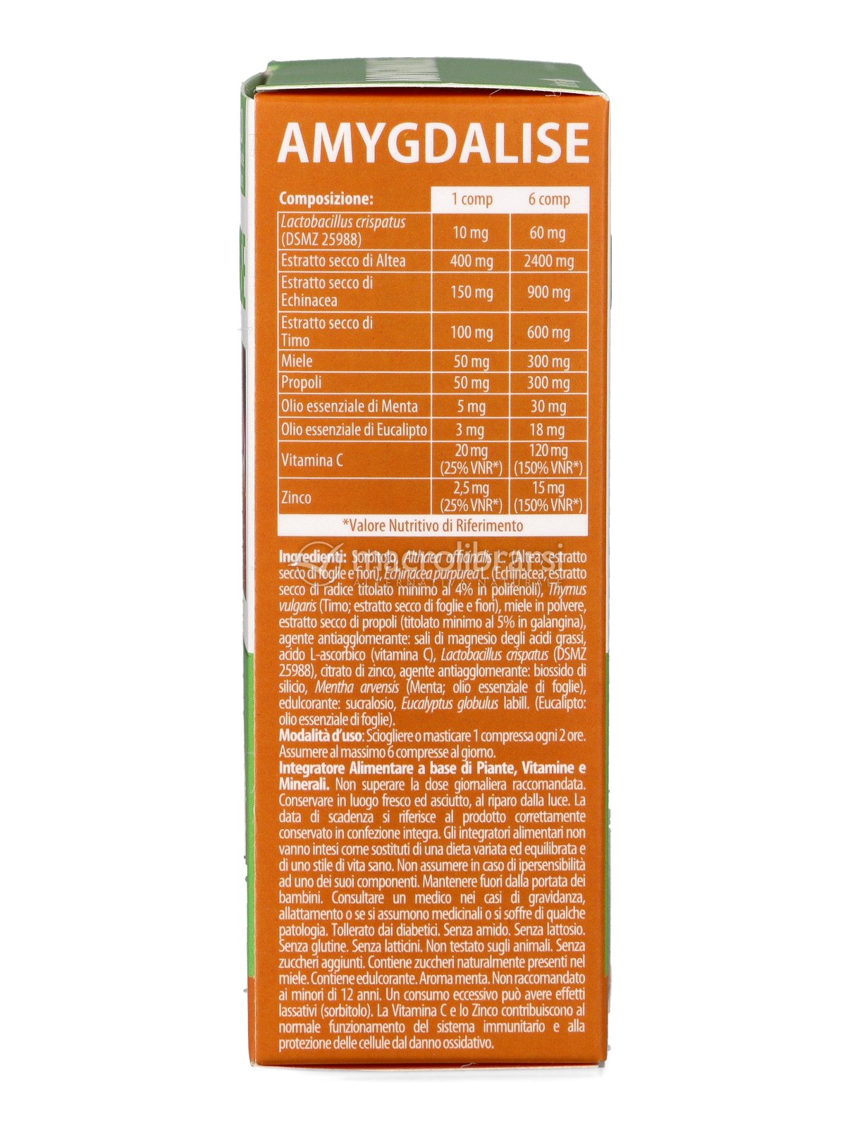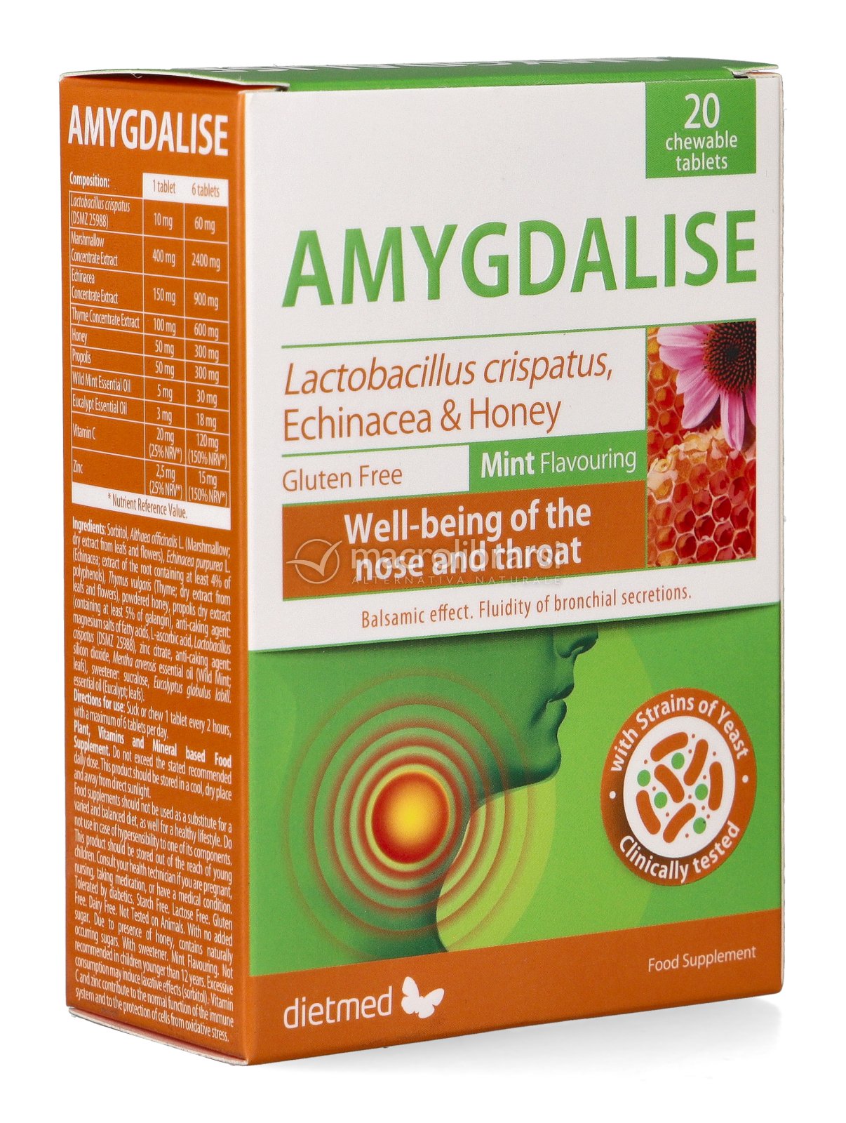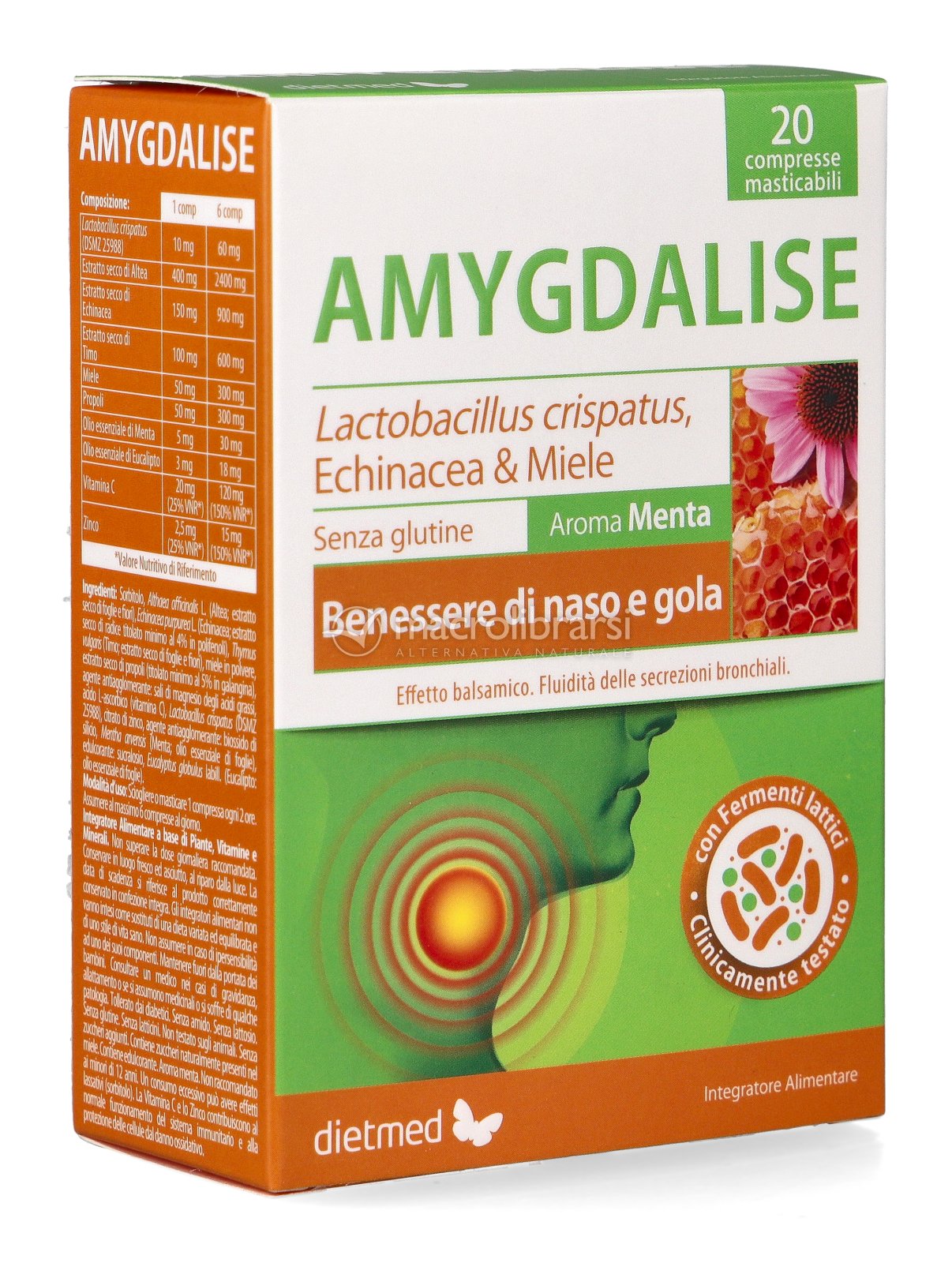 Amygdalise di Dietmed è un'integratore alimentare formulato per sostenere il benessere di naso e gola. Contiene fermenti lattici di Lactobacillus crispatus a sostegno delle difese, miele ed Echinacea dalle proprietà antinfiammatorie.