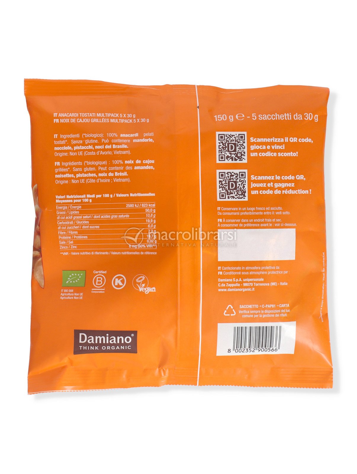 La certificazione Bio, Kosher e Vegan testimonia l'impegno verso la qualità e la sostenibilità del prodotto. Composto unicamente da anacardi tostati, una scelta consapevole per chi ricerca un'alimentazione equilibrata e rispettosa dell'ambiente.