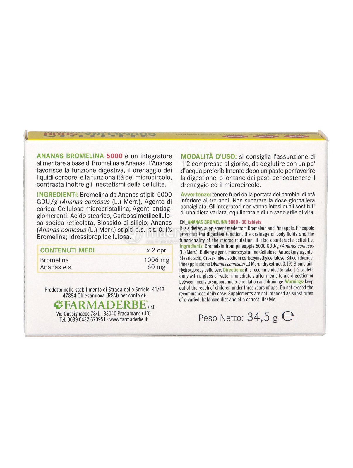 Ananas Bromelina 5000 di Farmaderbe è un integratore di bromelina pura enzimaticamente attiva, estratta da ananas. La bromelina nell'integratore è titolata, cioè ad alta concentrazione di principio attivo, per garantire un'efficacia ancora maggiore.