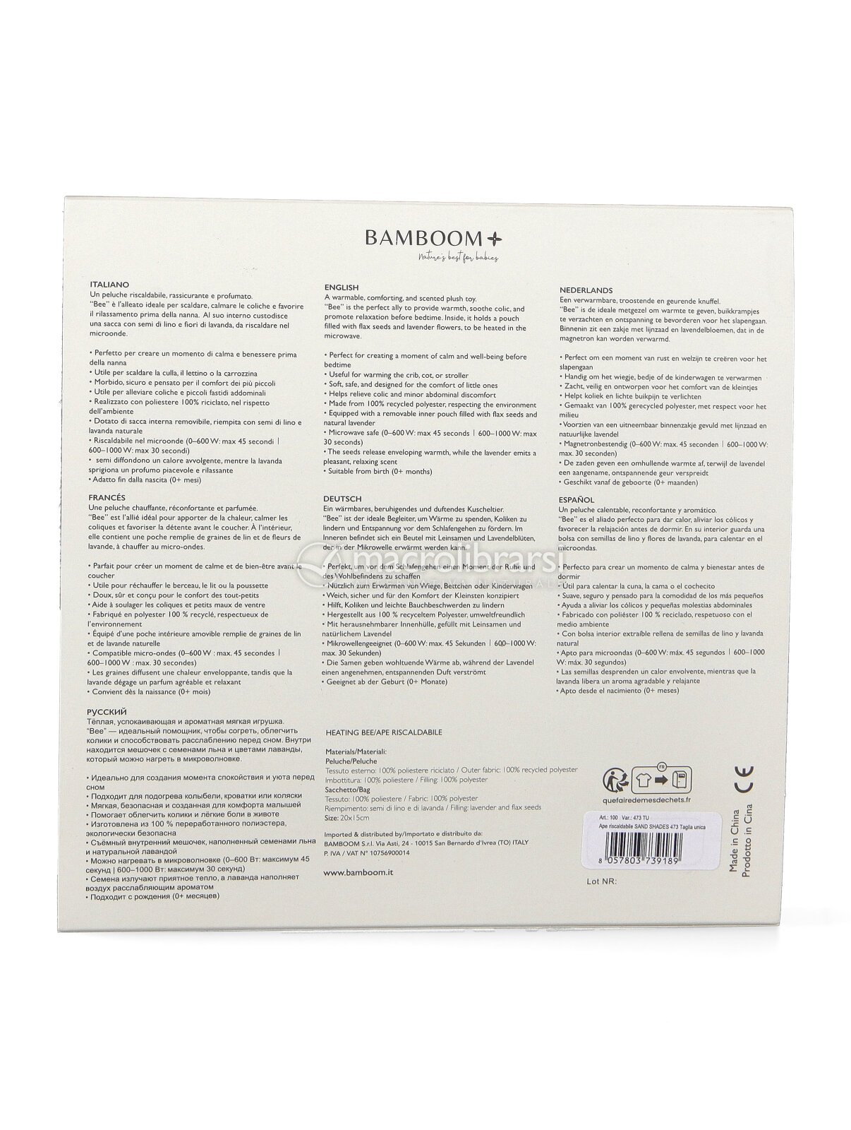| Avvertenze | Rimuovere tutte le confezioni, elementi di fissaggio ed etichette prima di consegnare il giocattolo al bambino. Utilizzare sotto la supervisione di un adulto. Non lasciare il bambino incustodito durante l'uso. Verificare regolarmente l'integrità del prodotto e, in caso di segni di usura o danneggiamento, sospendere l'uso. Tenere lontano da fonti di calore, fiamme libere e oggetti incandescenti. Per scaldare il prodotto, rimuovere il sacchetto interno e scaldare solo il sacchetto, seguendo attentamente le istruzioni. Non scaldare il peluche. Assicurarsi che il peluche sia completamente chiuso prima di consegnarlo al bambino. Verificare sempre che il peluche non sia troppo caldo prima di darlo al bambino. Conservare il giocattolo in un luogo asciutto, lontano da fonti di calore, luce diretta e umidità. |