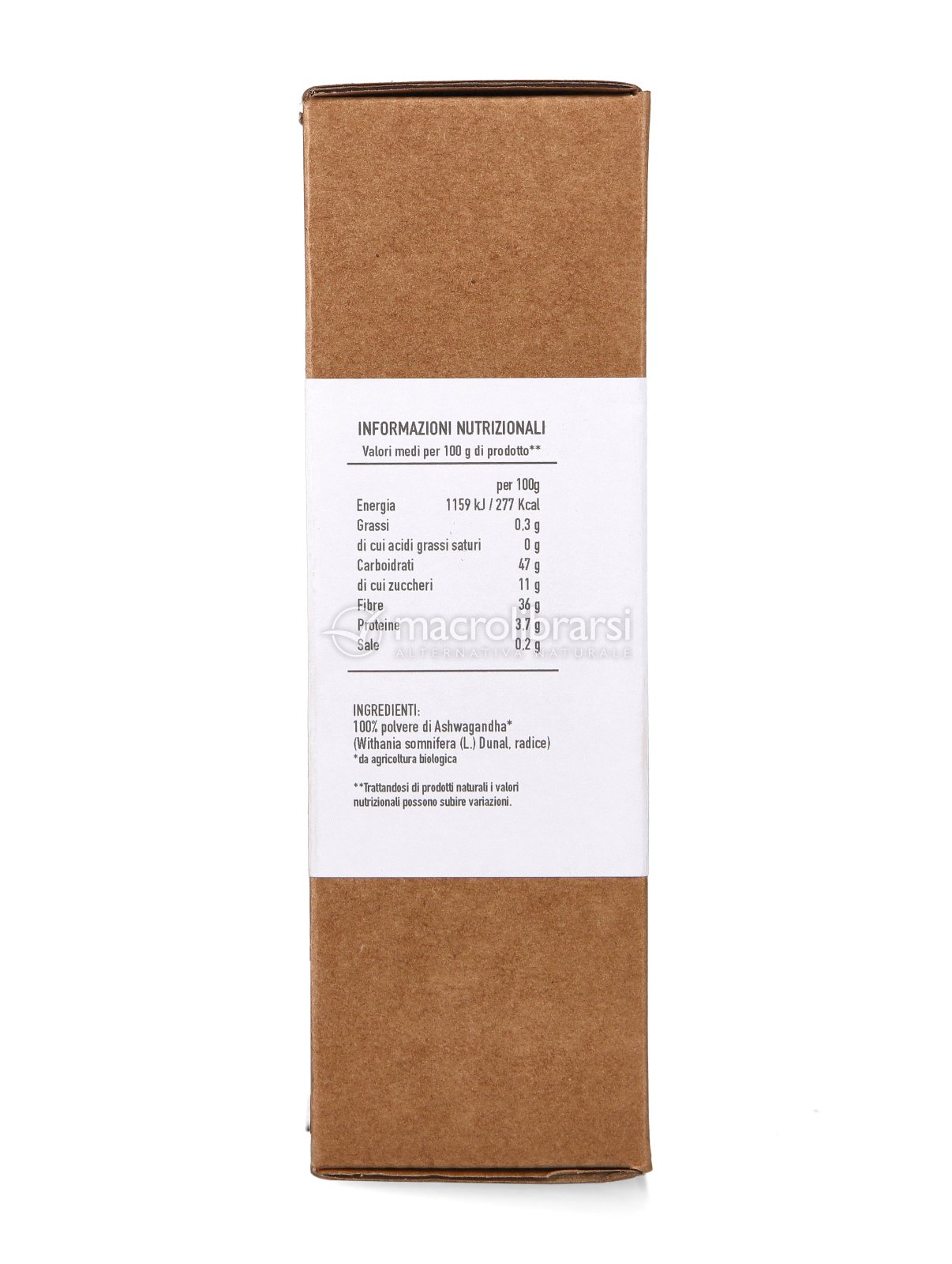| Note | Le radici vengono raccolte con cura, selezionate ed essiccate naturalmente a bassa temperatura (sotto i 50° C) per preservarne tutte le proprietà nutrizionali. Le radici vengono poi macinate in polvere per una migliore assimilazione. Ogni lotto viene inoltre testato in laboratorio per garantirne la qualità e la purezza (senza additivi, alcol o solventi). |