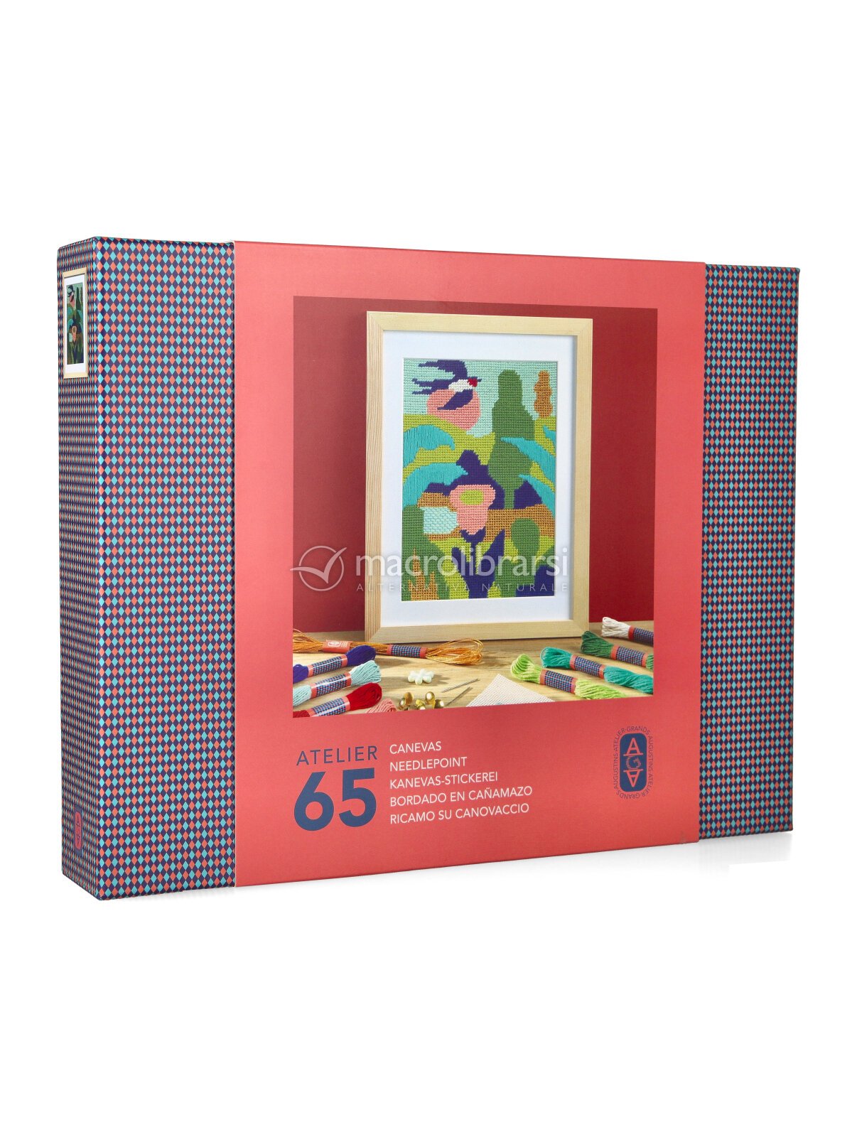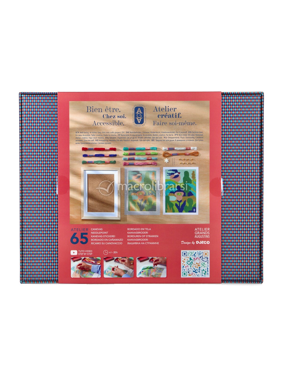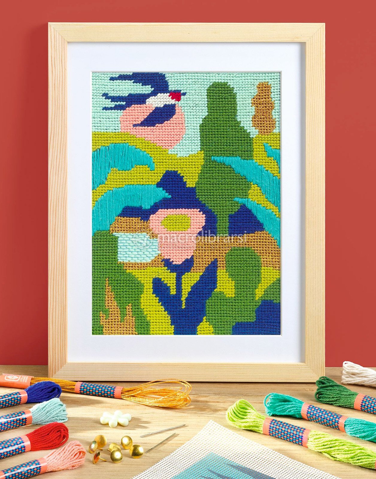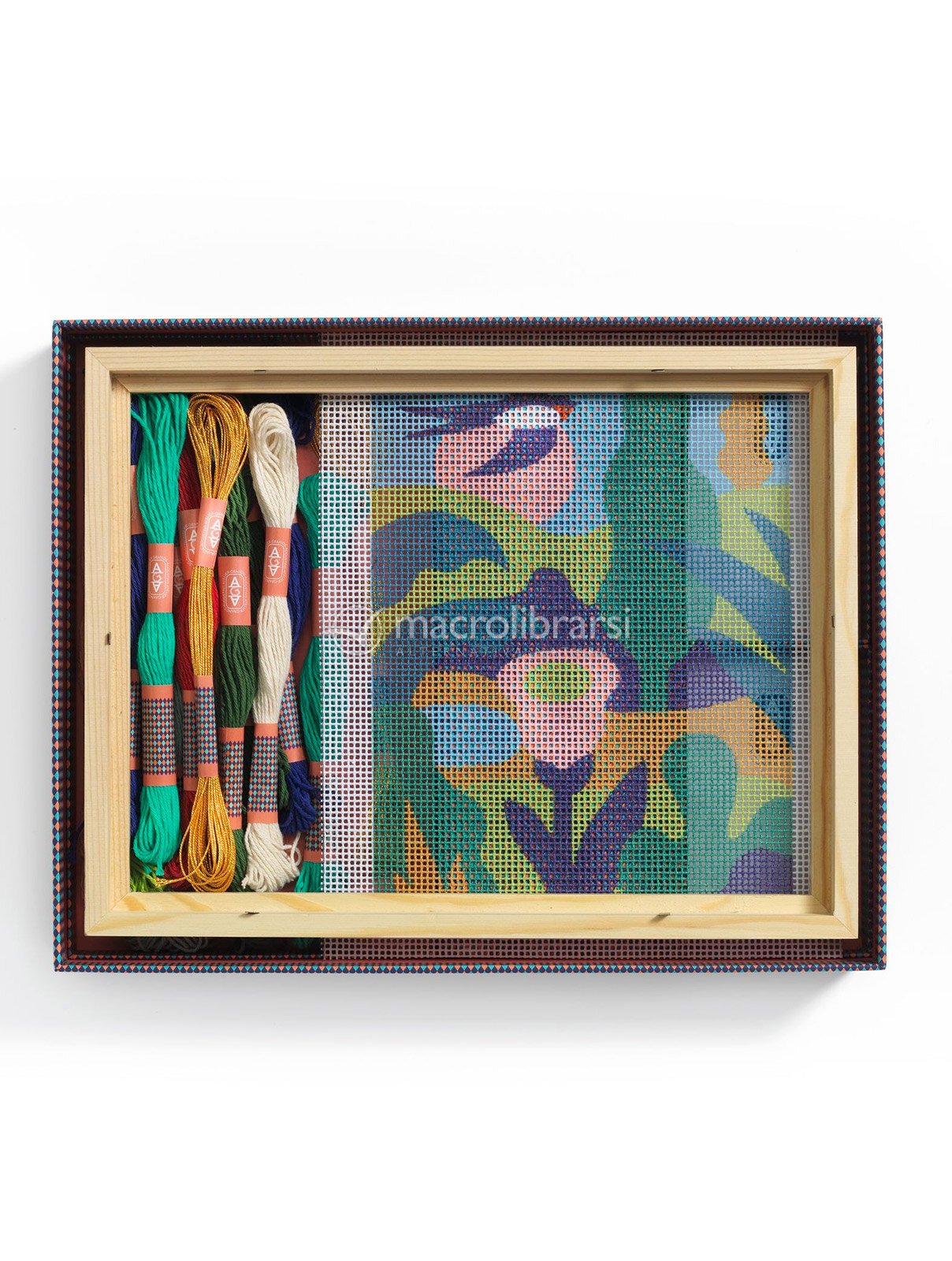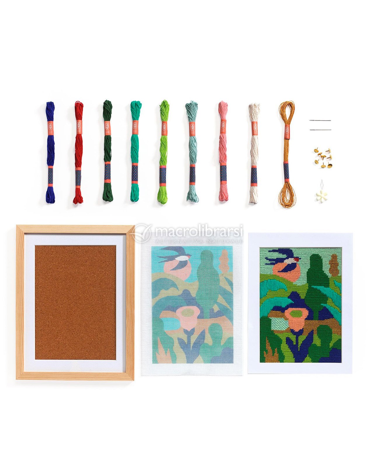 Il kit include tutto il necessario: la tela stampata, 9 fili colorati da 15 metri, 2 aghi, uno strumento passa-filo, una cornice in legno e punte decorative, più un video tutorial accessibile via QR code per seguire ogni passaggio con facilità.