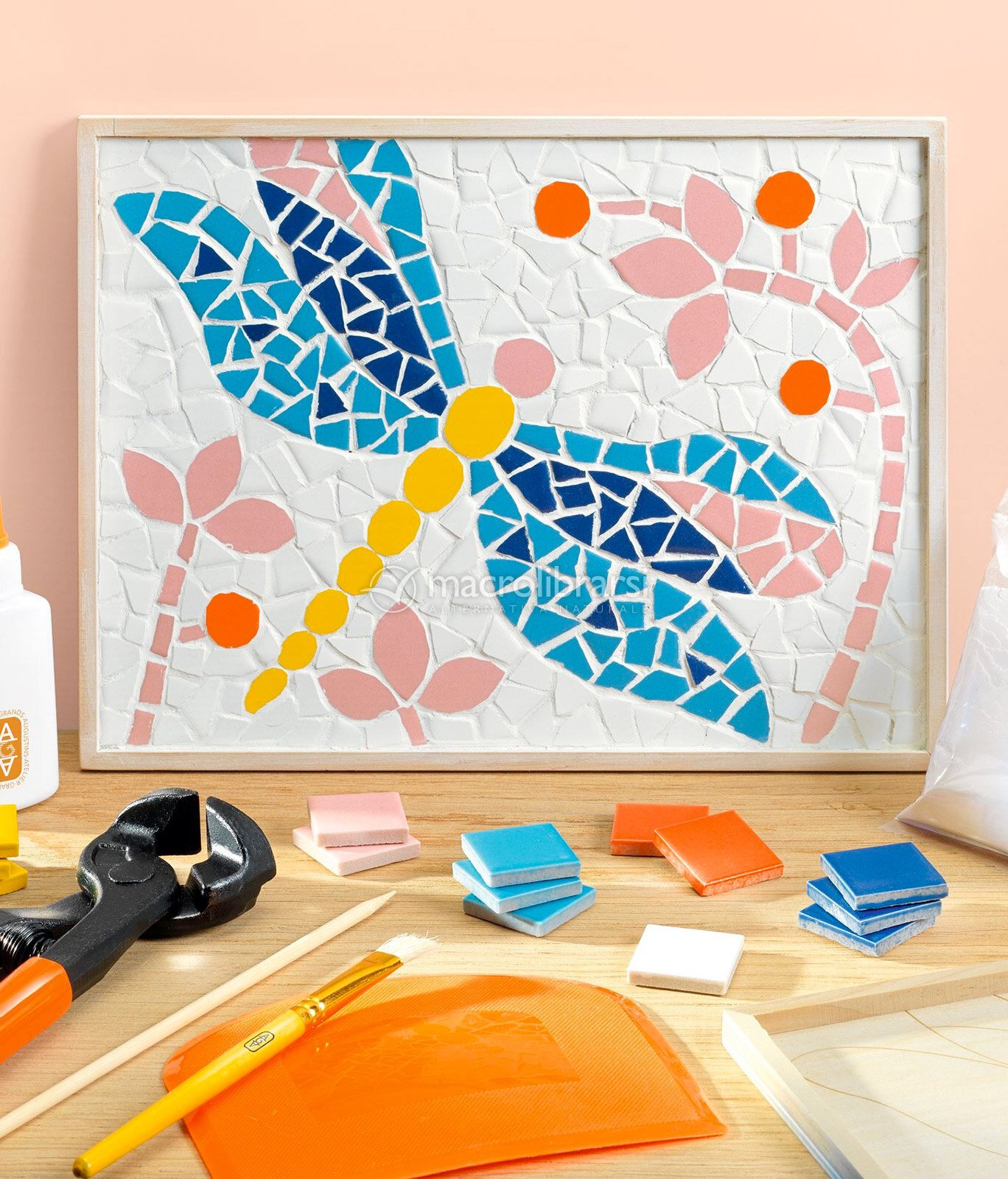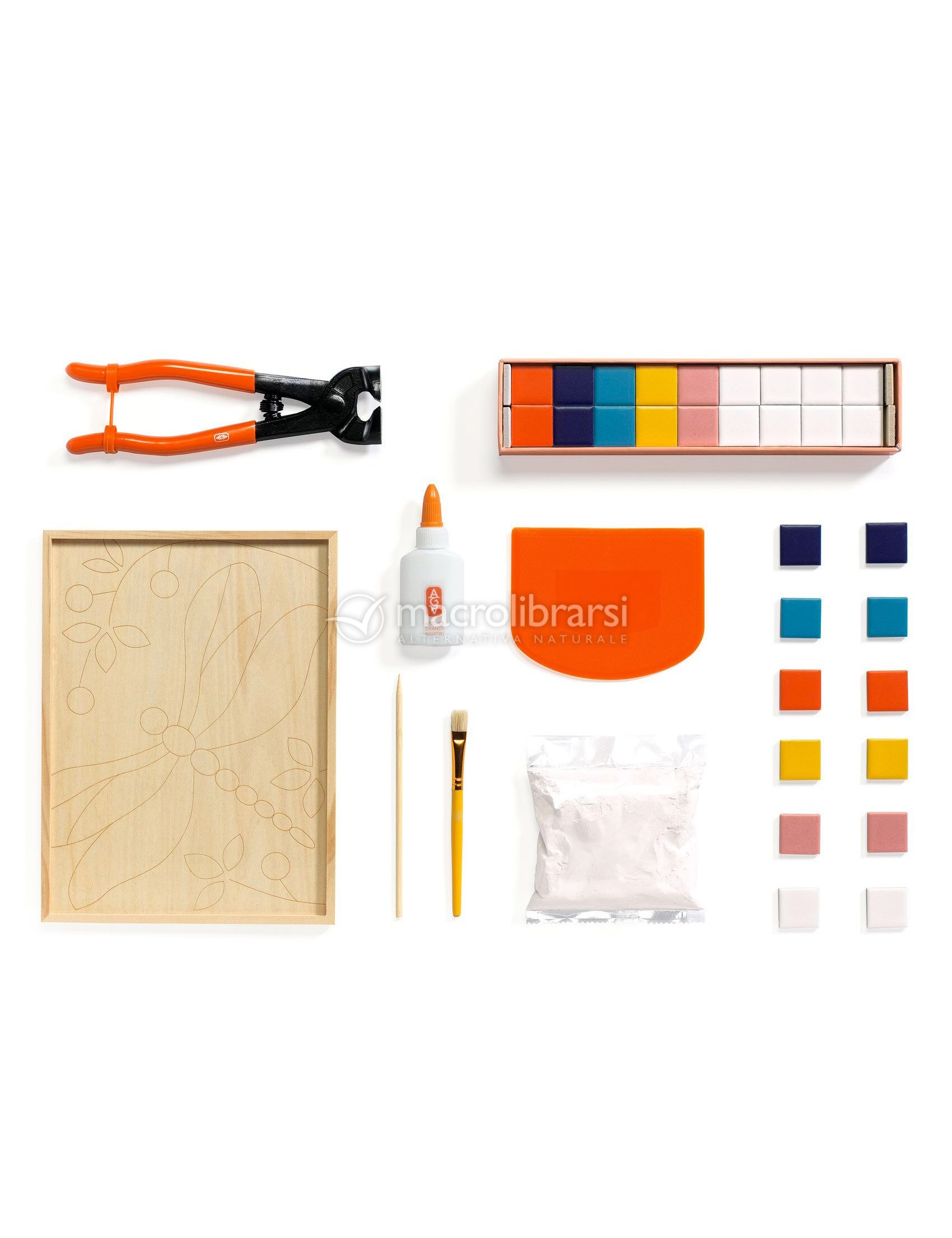 Scopri il fascino della tecnica musiva con Atelier 72 - Libellula di Djeco: un set completo per realizzare un mosaico autentico, usando strumenti veri da artigiano.