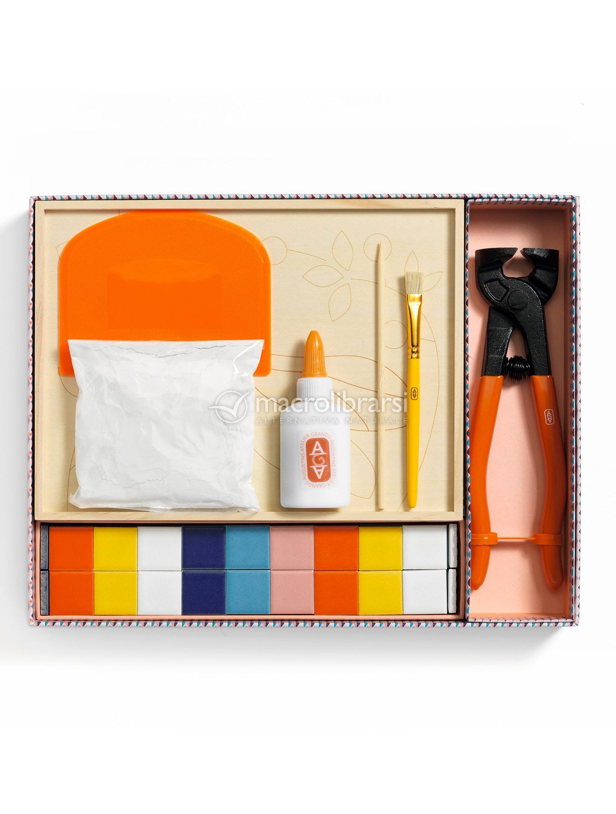 Il kit include tutto l’occorrente: un supporto in legno stampato, 100 tessere in ceramica, una pinza da mosaico per tagliarle con precisione, un sacchetto di cemento, una spatola flessibile, un tubetto di colla, un modello da seguire e una scheda con codice QR per scaricare il video tutorial e vivere al meglio questa esperienza creativa, meditativa e bellissima da regalare (o regalarsi).