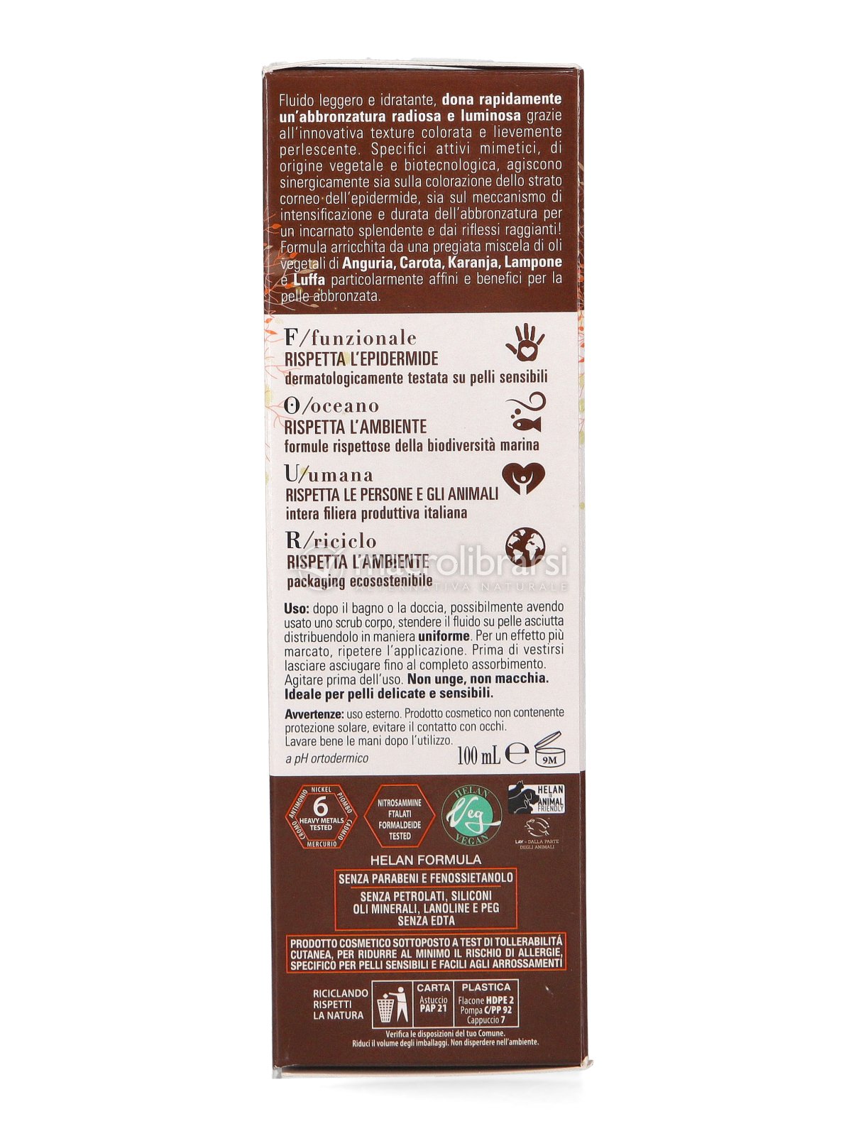 La texture colorata e lievemente perlescente dona un'abbronzatura immediata e naturale. Gli attivi mimetici di origine vegetale e biotecnologica intensificano e prolungano l'abbronzatura, per un incarnato splendente. La formula è arricchita con oli vegetali di Anguria, Carota, Karanja, Lampone e Luffa, che idratano e nutrono la pelle. Questi oli sono particolarmente benefici per la pelle abbronzata.