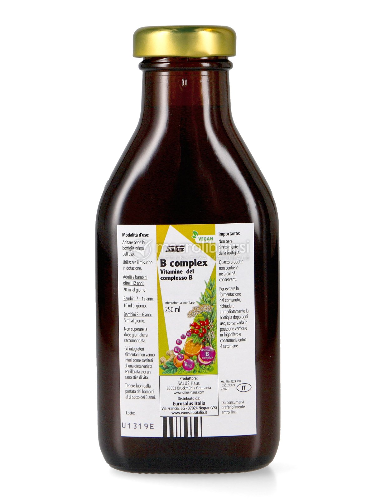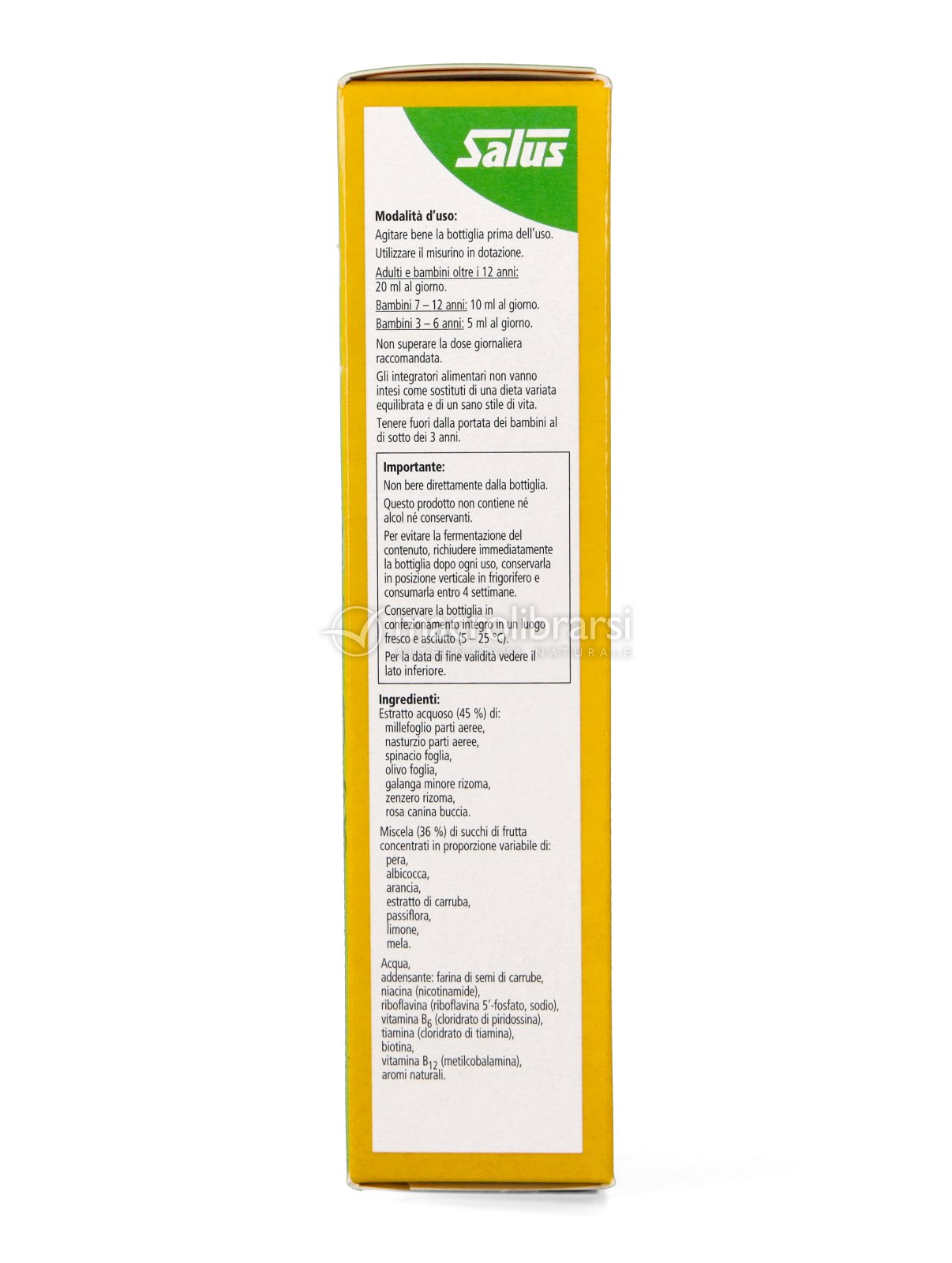 L’integrazione delle vitamine viene completata e resa gradevole nel gusto dalla presenza di succhi vegetali di frutta e verdura, in particolare la passiflora e l’arancia rendono B Complex Salus fruttato e piacevole, mentre gli estratti acquosi lo arricchiscono e agiscono in sinergia con le vitamine.