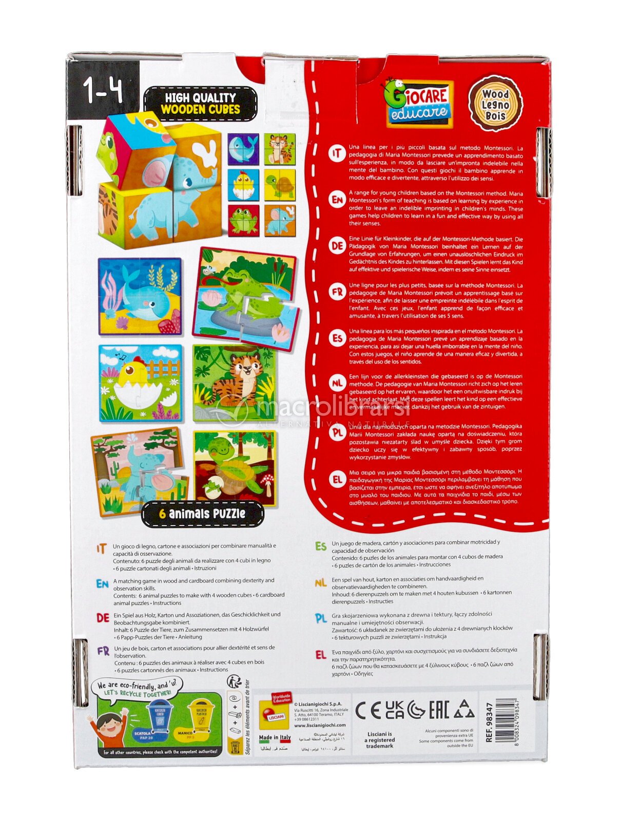 Con i 4 cubi in legno si possono formare le immagini degli animali protagonisti dei 6 puzzle in cartone da 4 pezzi ciascuno.