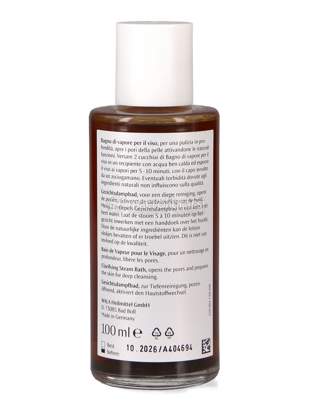 Una o due volte la settimana aggiungere due cucchiai di Bagno di vapore per il viso a ½ litro circa di acqua ben calda. Esporre il viso ai vapori, con il capo coperto da un asciugamano, per 5-10 minuti.