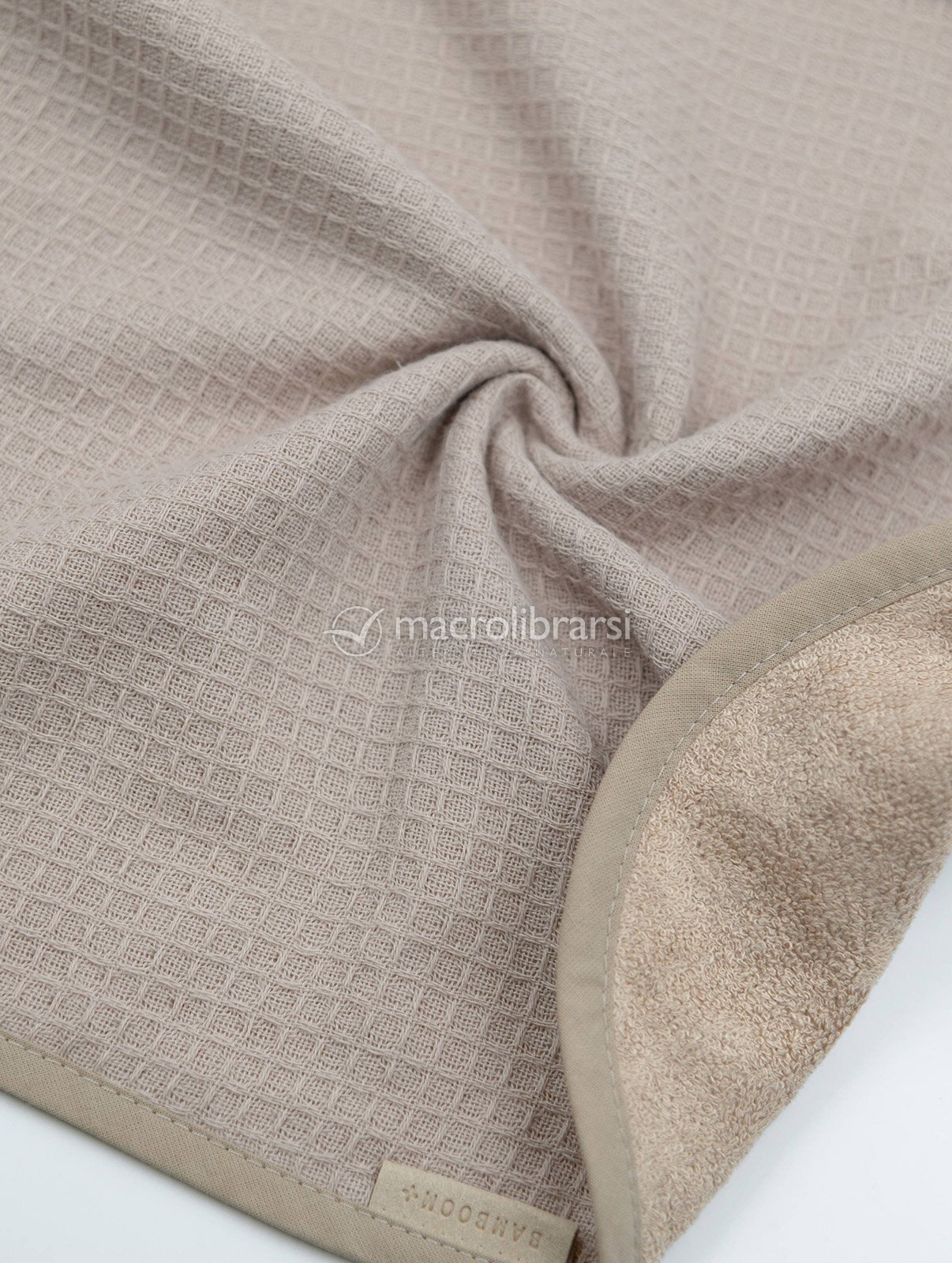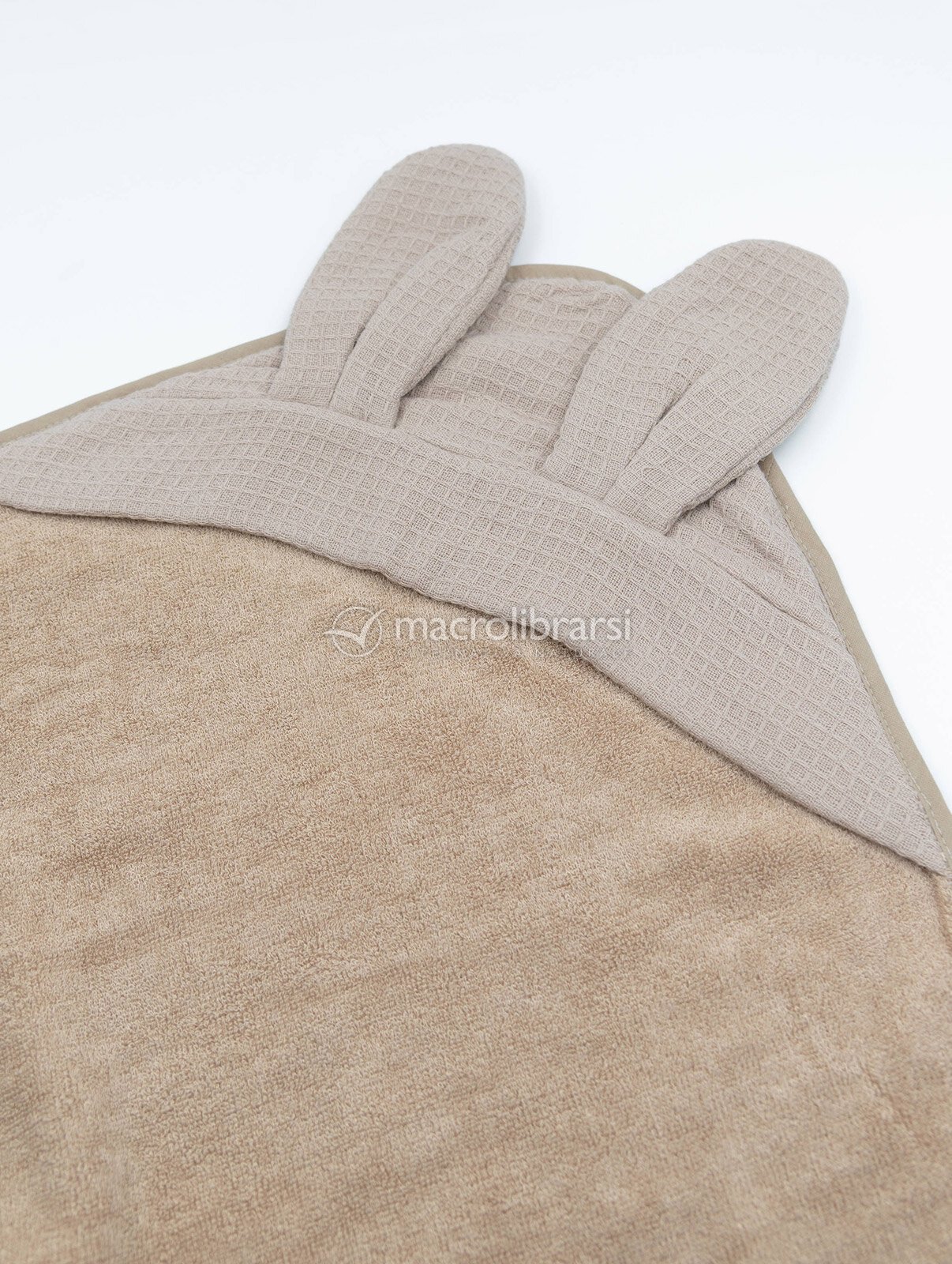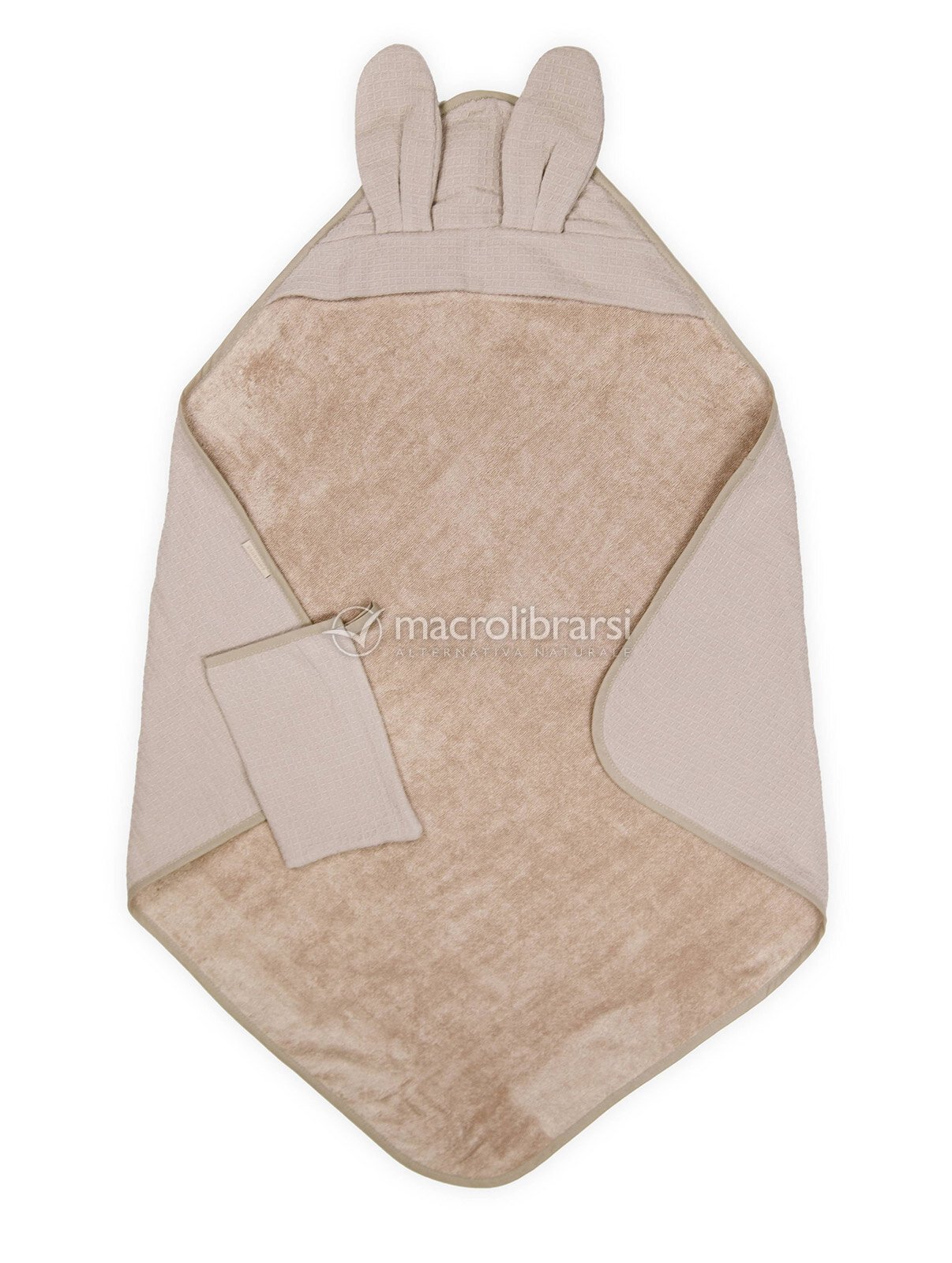 Set composto da un asciugamano con cappuccio e un guanto con trama waffle in cotone e bambù organici color sabbia.