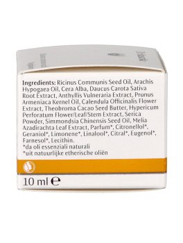 La sua composizione a base di carota, antillide, neem, cera d'api, burro di cacao, seta e olio di nocciolo di albicocca rinforza la delicata zona perioculare, levigandola e proteggendola dagli agenti esterni.