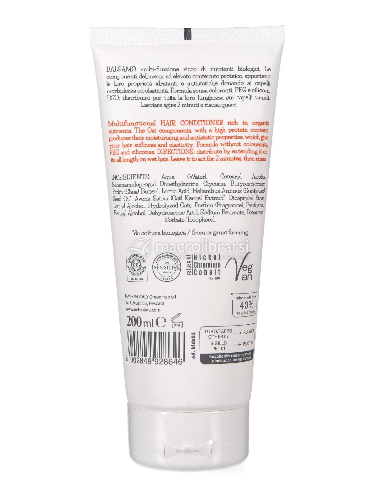 Le componenti dell'avena apportano un'efficace idratazione e un'azione antistatica, elementi chiave per garantire capelli morbidi ed elastici. La formulazione, studiata per le esigenze dei bambini, è priva di coloranti, PEG e siliconi, assicurando un trattamento rispettoso e delicato.