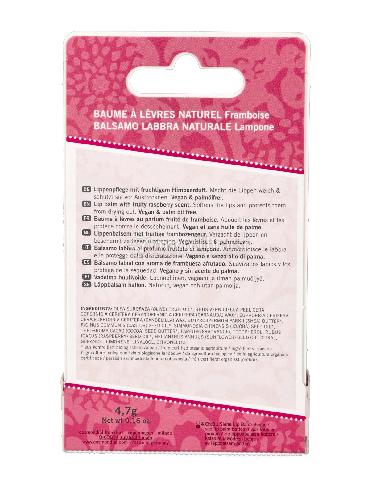 Olea europaea (olive) fruit oil*, Rhus verniciflua peel cera, Copernicia cerifera cera/copernicia cerifera (carnauba) wax*, Euphorbia cerifera cera/euphorbia cerifera (candelilla) wax, Ricinus communis (castor) seed oil*, Butyrospermum parkii (shea) butter*, Theobroma cacao (cocoa) seed butter*, Simmondsia chinensis (jojoba) seed oil*, Cetyl Alcohol, Parfume (fragrance), Rubus idaeus (Raspberry) seed oil*, Tocopherol, Helianthus annuus (sunflower) seed oil, Citral, Geraniol, Limonene, Linalool, Citronellol - *da agricoltura biologica