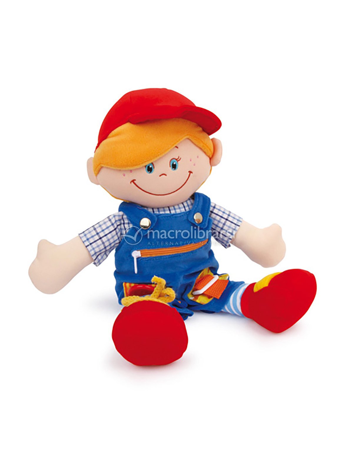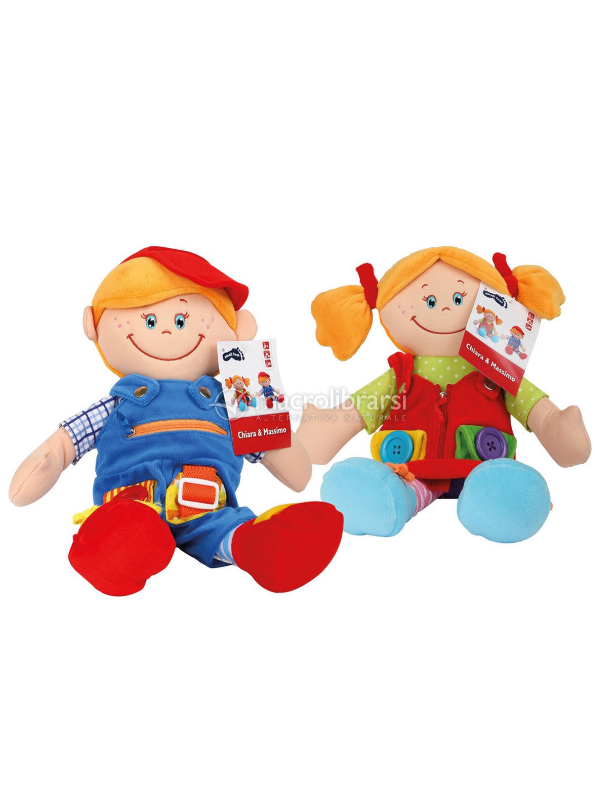 Due bambole in stoffa per imparare a fare i lacci alle scarpe, chiudere le zip, staccare e riattaccare i bottoni, staccare e riattaccare velcri.
