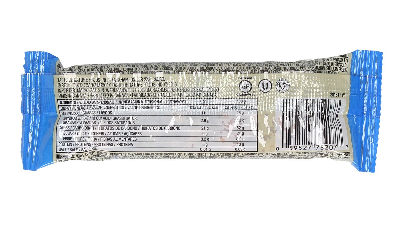 Il suo indice glicemico basso (44.3 sulla base dei test effettuati, dove 50 rappresenta la soglia) lo rende adatto anche a chi deve mantenere un livello basso di zuccheri nel sangue. Realizzata in Canada, la barretta al mirtillo bio "Taste of Nature" combina ingredienti naturali e di alta qualità con la praticità di uno snack facilmente trasportabile.