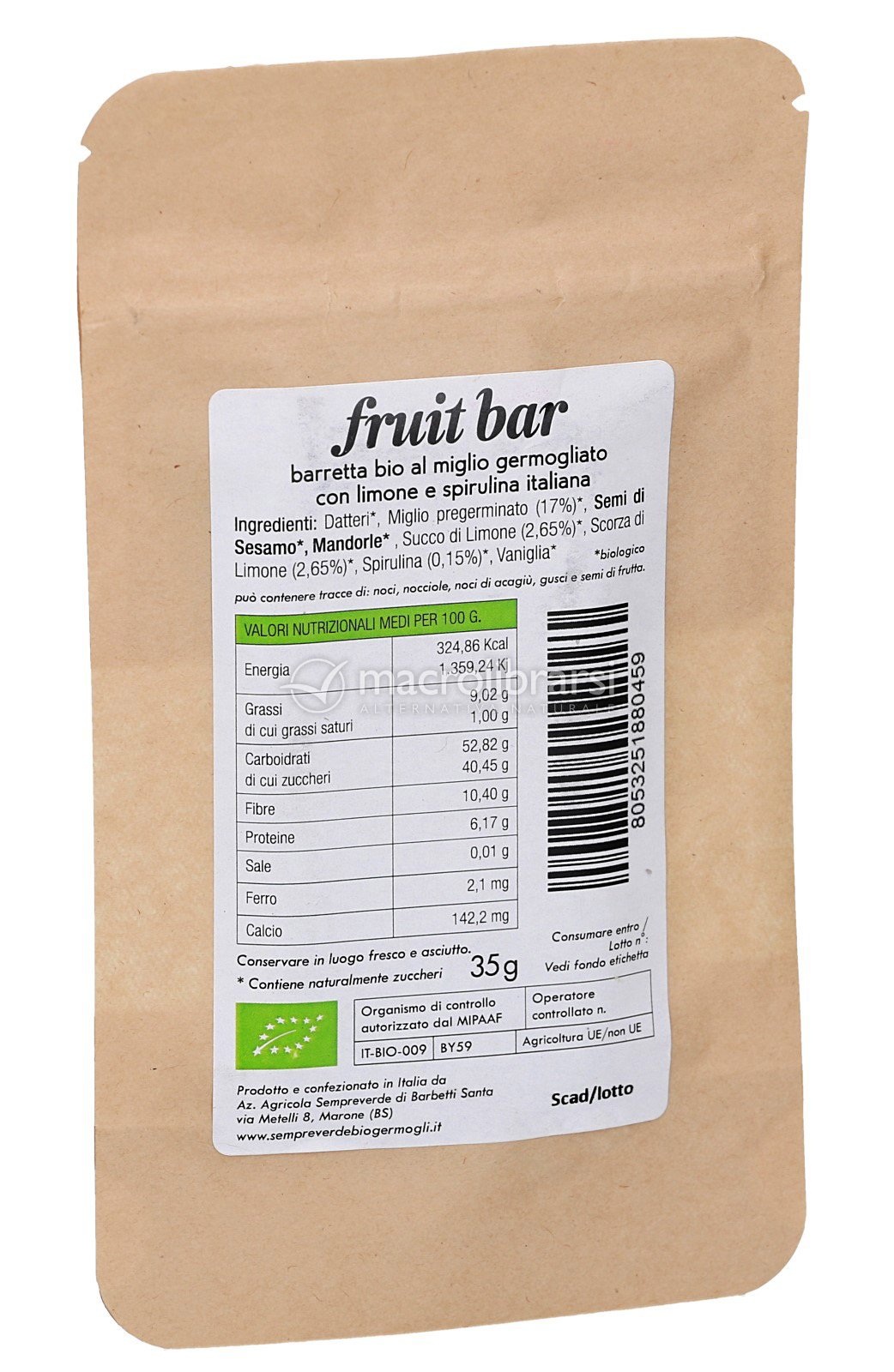 Miglio germogliato, datteri, semi di sesamo, mandorle, succo di limone, scorza di limone, spirulina, vaniglia.