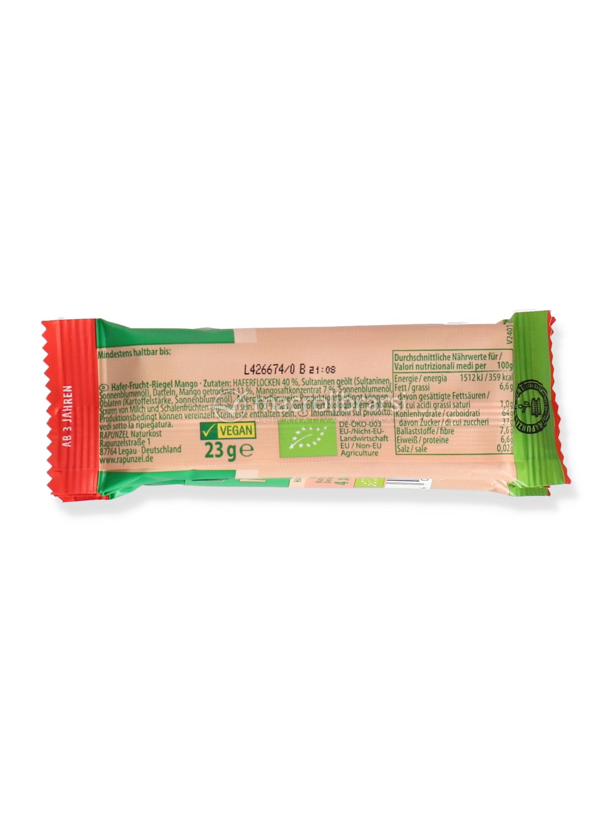 Fiocchi d'avena*(40,00%), uva sultanina oliata* (uva sultanina*, olio di girasole*), datteri*, mango essiccato*(11,00%), succo di mango concentrato*(7,00%), olio di girasole*, cialda* (amido di patate*, olio di girasole*) * = ingredienti da agricoltura biologica ** = da agricoltura biodinamica