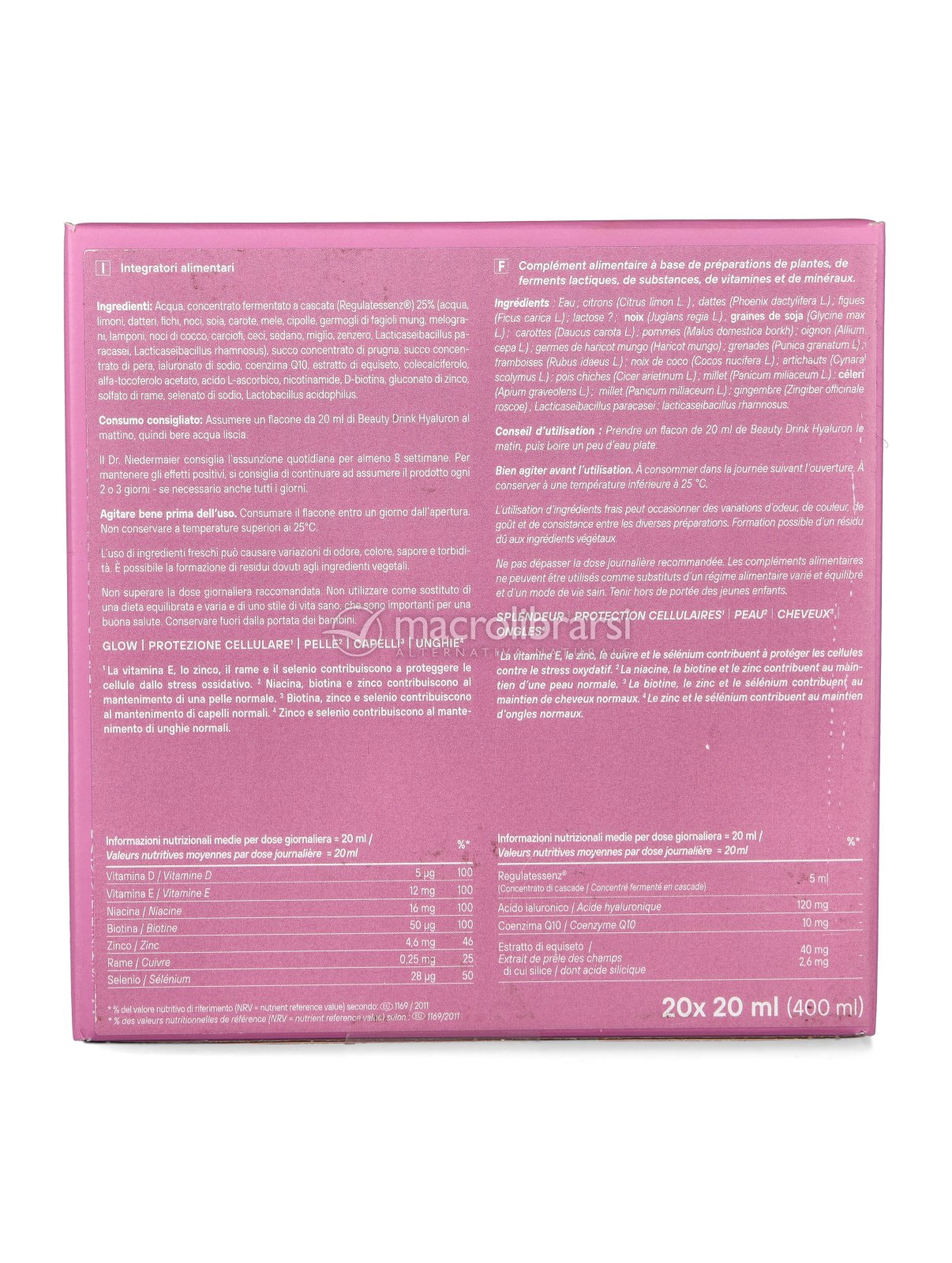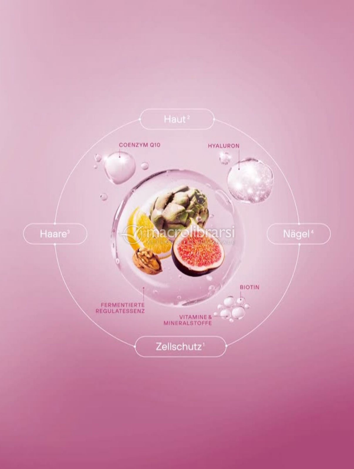 Acqua, concentrato fermentato a cascata (Regulatessenz®) 25% (acqua, limoni, datteri, fichi, noci, soia, carote, mele, cipolle, germogli di fagioli mung, melograni, lamponi, noci di cocco, carciofi, ceci, sedano, miglio, zenzero, Lacticaseibacillus paracasei, Lacticaseibacillus rhamnosus), succo concentrato di prugna, succo concentrato di pera, ialuronato di sodio, coenzima Q10, estratto di equiseto, colecalciferolo, alfa-tocoferolo acetato, acido L-ascorbico, nicotinamide, D-biotina, gluconato di zinco, solfato di rame, Selenato di sodio, Lactobacillus acidophilus