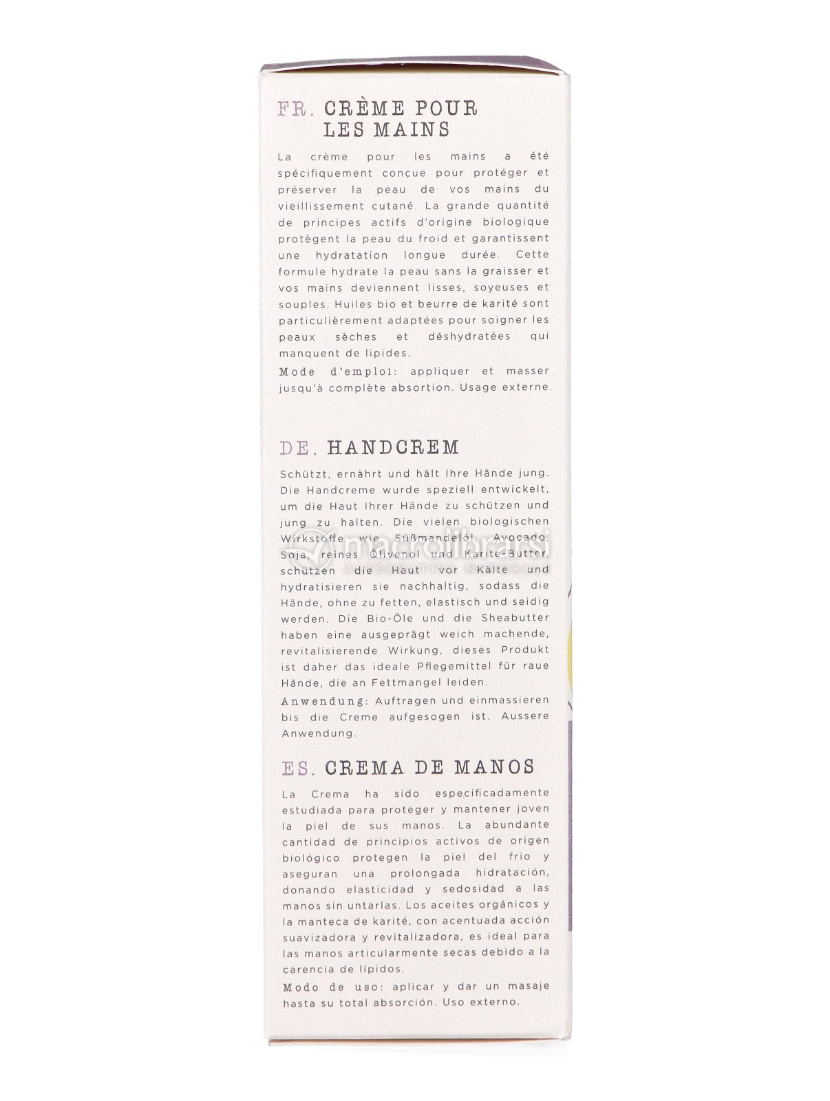 L'abbondante quantità di principi attivi di origine biologica protegge la pelle dal freddo ed assicura una prolungata idratazione, dona elasticità e setosità alle mani, senza ungerle.