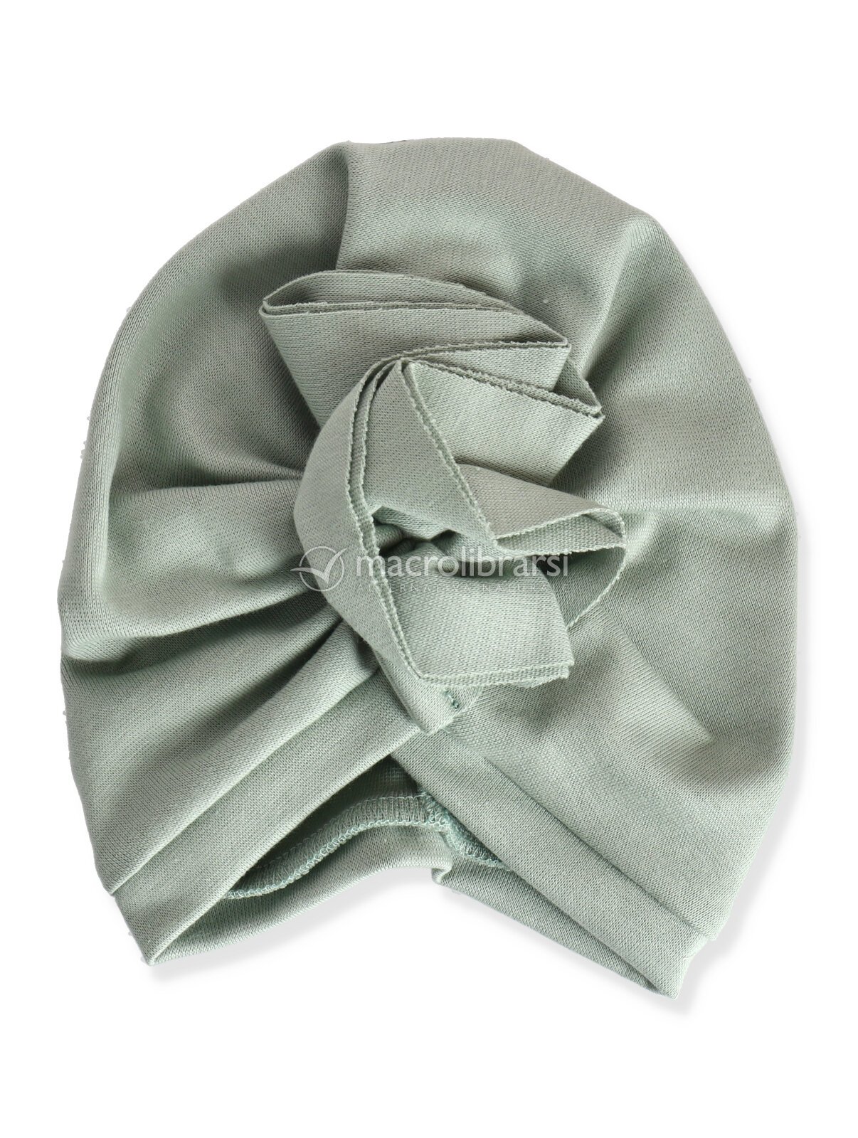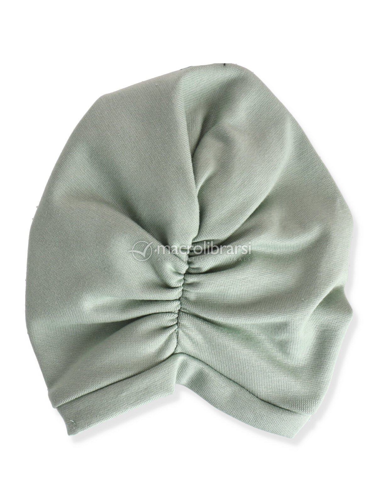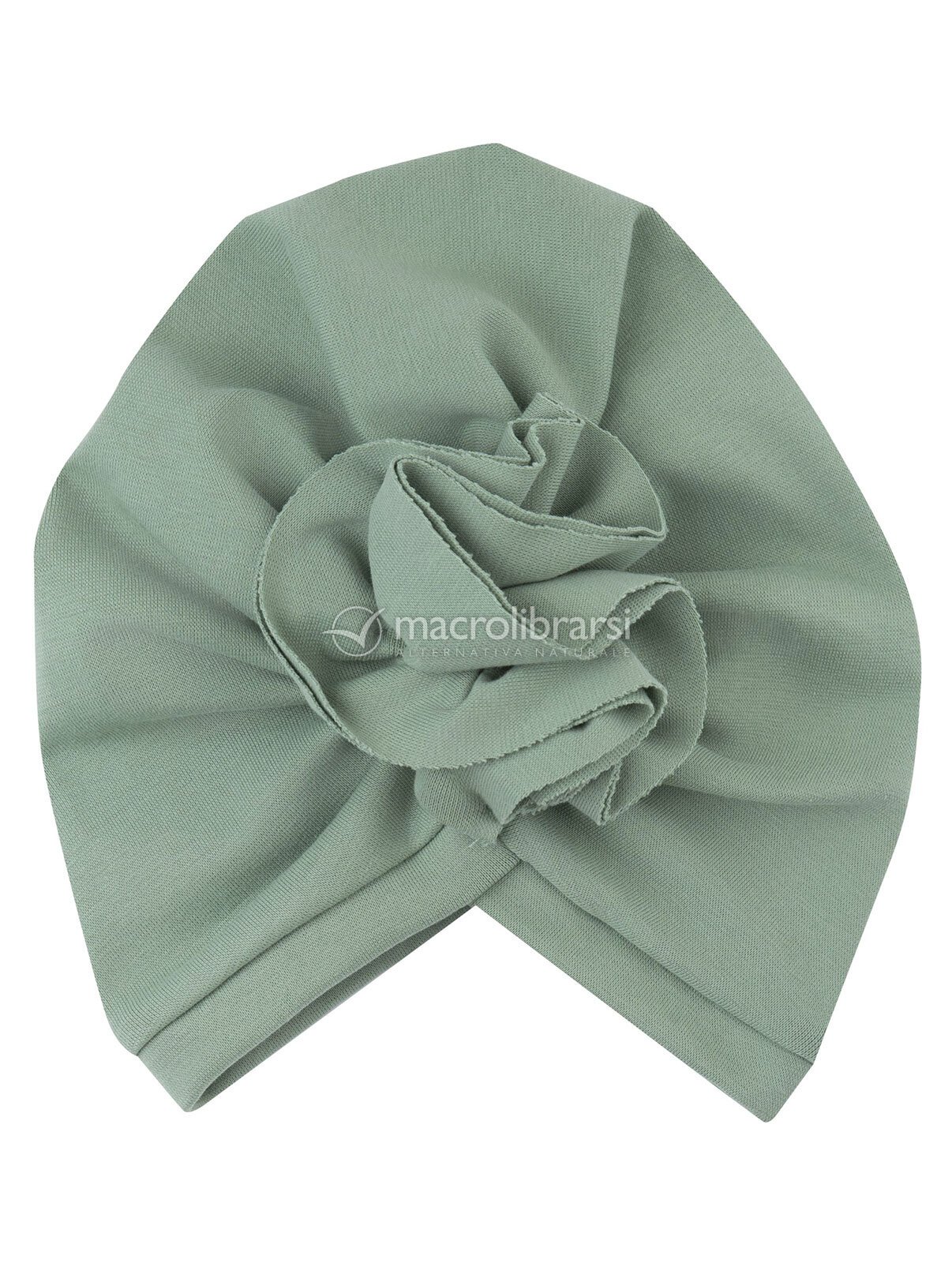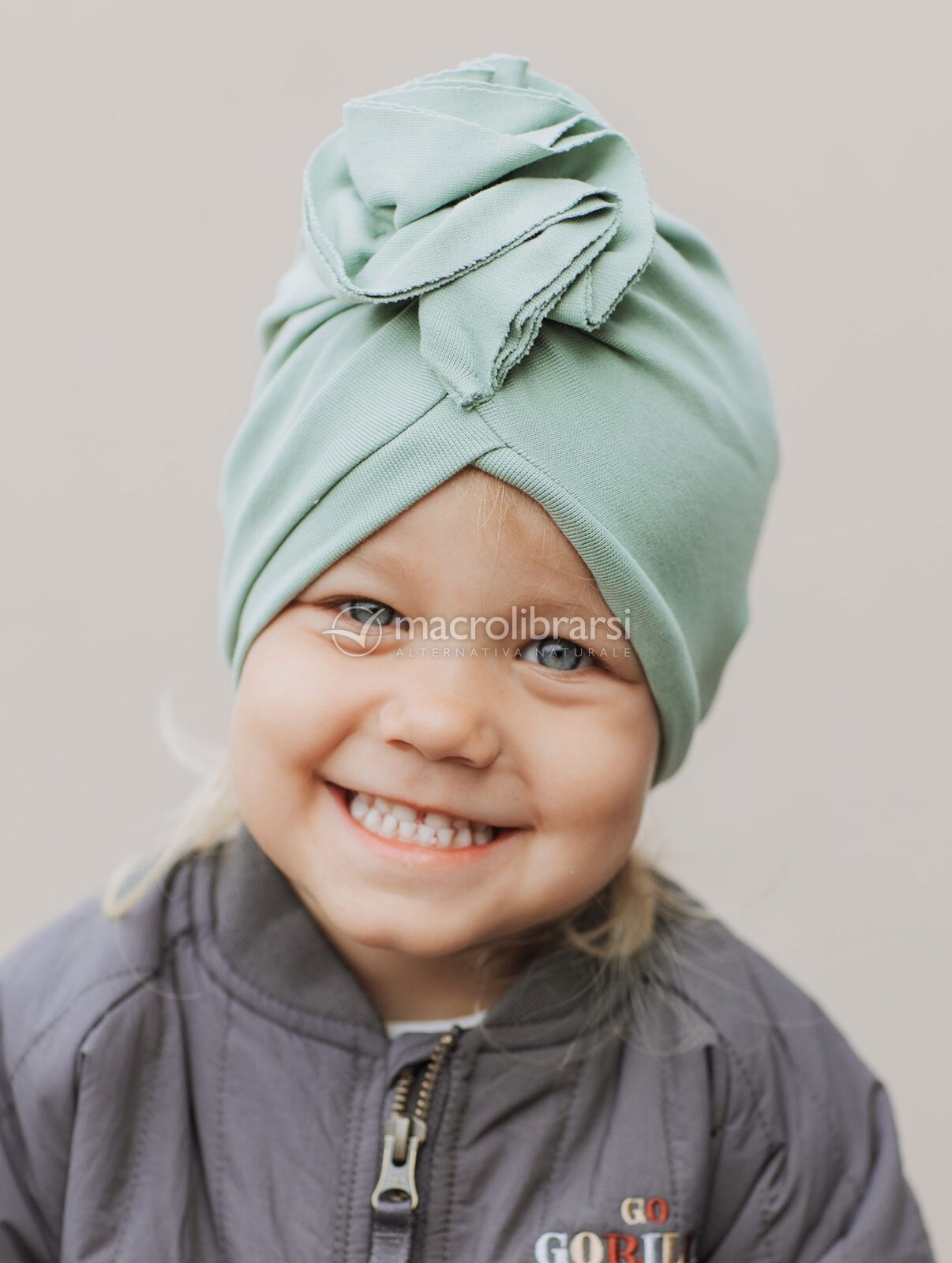 Cappellino a turbante con volant in cotone organico verde oliva, adatta a bambine da 1 a 3 anni.