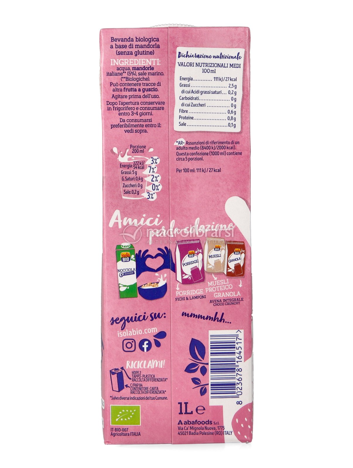 Solo mandorle e acqua, senza zuccheri, grassi, senza glutine e addensanti. Isola Bio è una marca italiana ottima di prodotti eccezionali! Lo compro in pack da 6.