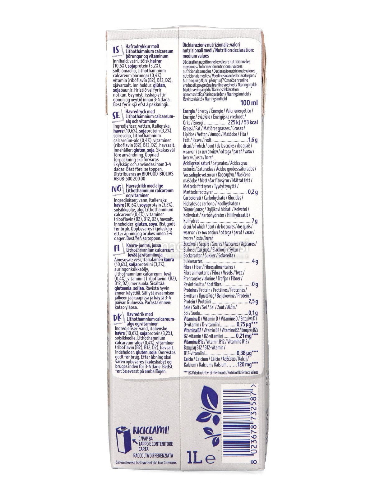 Acqua, avena italiana 10,5%, proteine di soia 3,2%, olio di girasole, alga Alga Lithothamnium calcareum 0,4%, vitamine B2, B12, D2, sale marino.