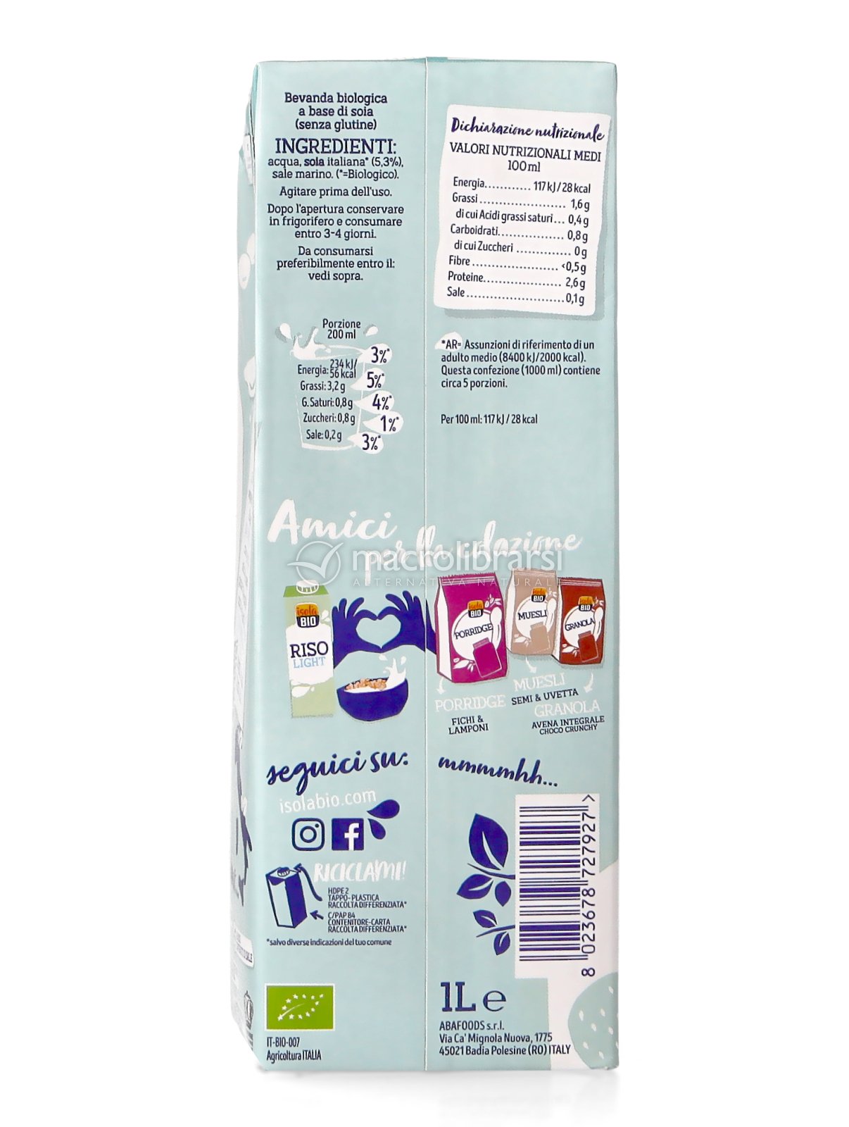 Cerchi una bevanda leggera e senza glutine? Trovata! Isola Bio Soia Light è prodotta con solo soia italiana e contiene almeno il 30% di calorie in meno rispetto alla ricetta tradizionale!