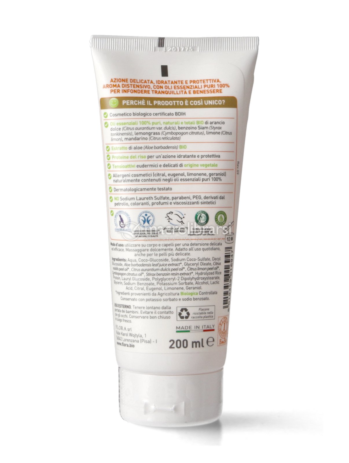 E' un cosmetico delicato adatto sia per bimbi piccoli che per quelli più grandicelli. Comodo perché deterge sia il corpo sia i capelli quindi perfetto da portare nella borsa della piscina come unico prodotto. Il profumo è delizioso agrumato e leggero, la consistenza è quella di un gel non fa tantissima schiuma e soprattutto non irrita gli occhi. I prodotti Flora sono eccellenti.