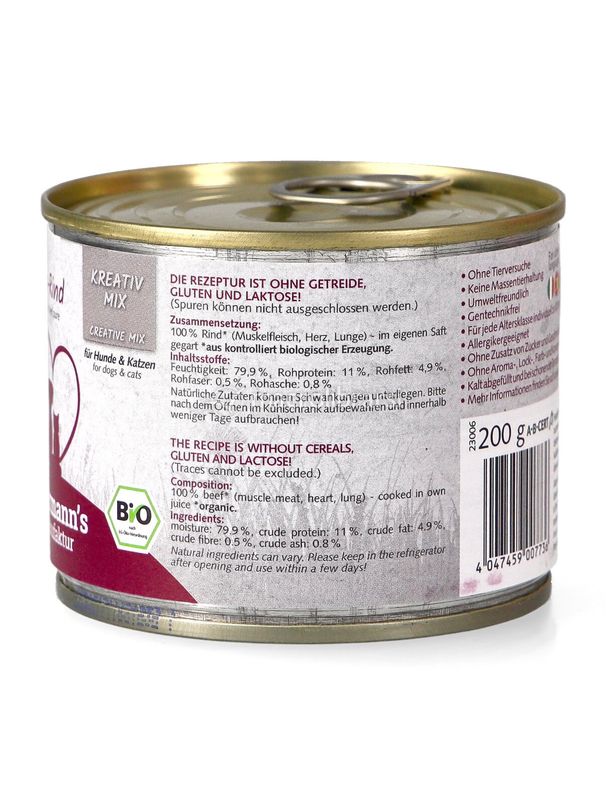 L'umido di puro manzo biologico Herrmann's Creative Mix è realizzato al 100% con carne biologica di qualità human grade cotta nel proprio sugo, facile da digerire e a basso contenuto di grassi.