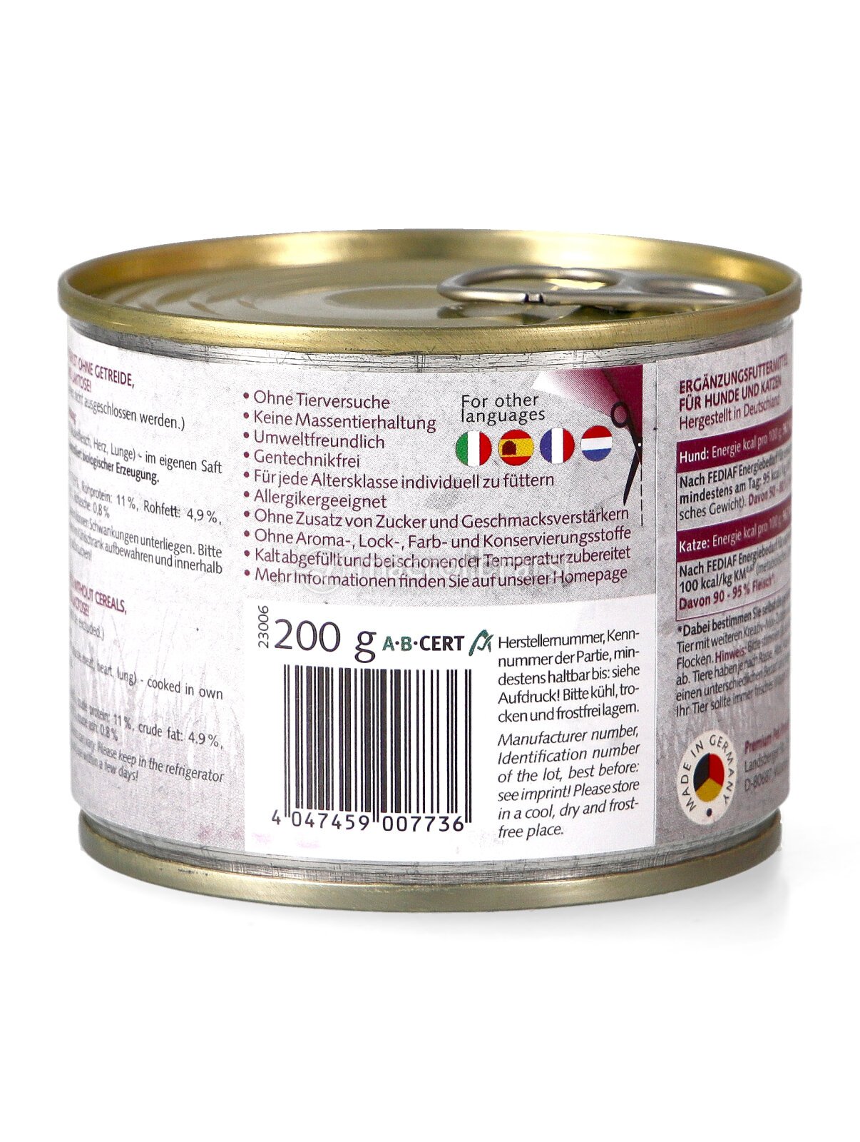Manzo 100% biologico (muscolo, cuore, polmone), cotto nel proprio sugo.