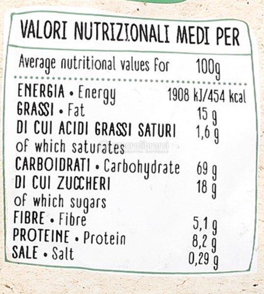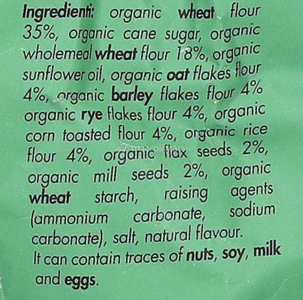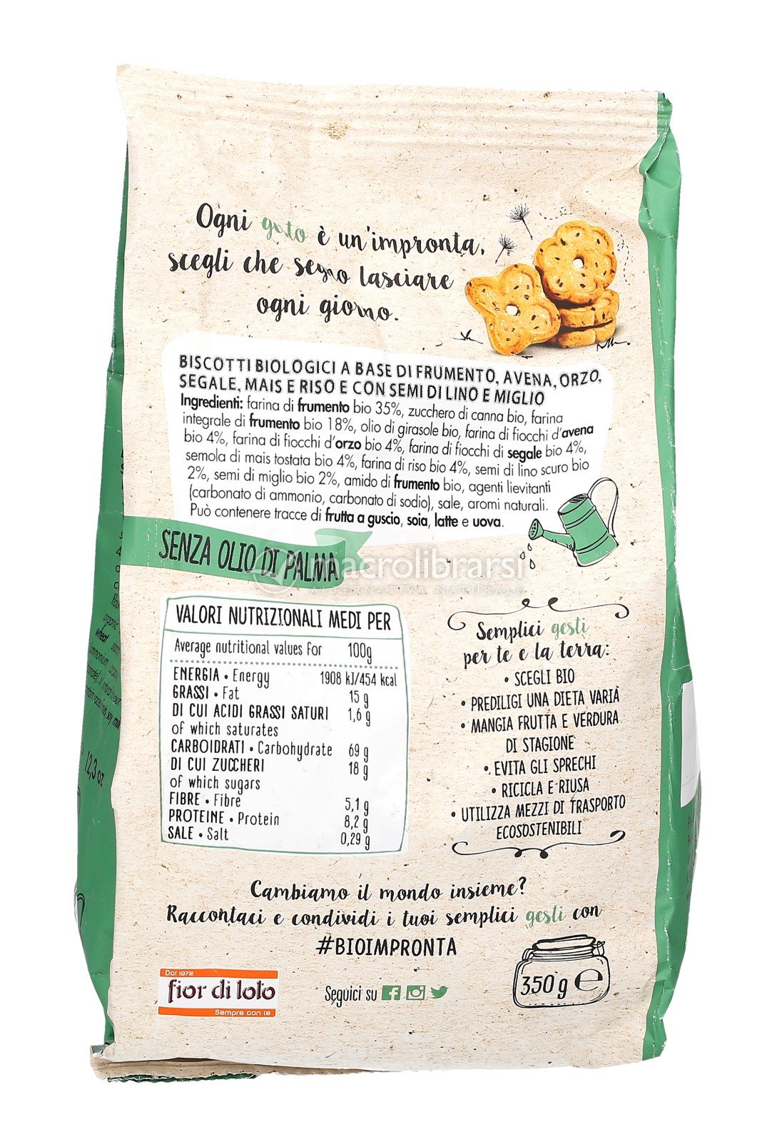 Frollini con frumento, fiocchi di orzo e avena, farina di riso e semi di miglio condito con olio di girasole e dolcificati con zucchero di canna.