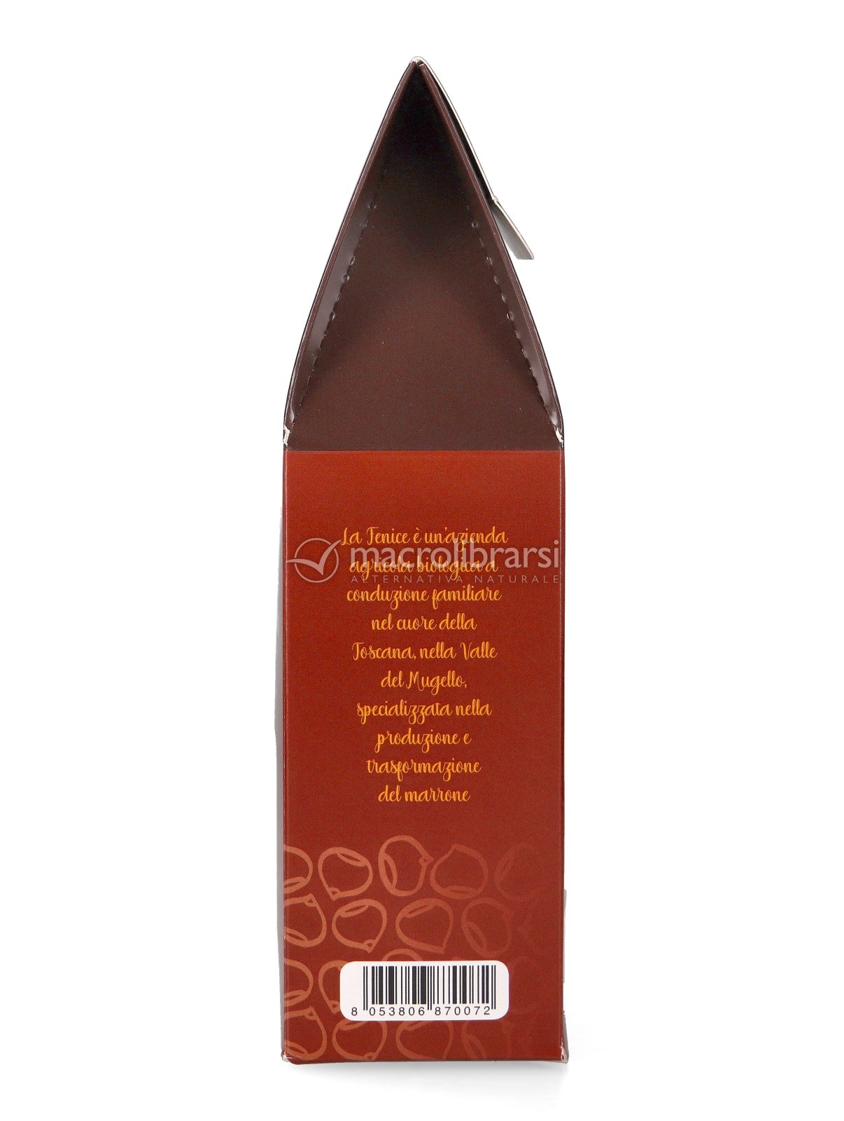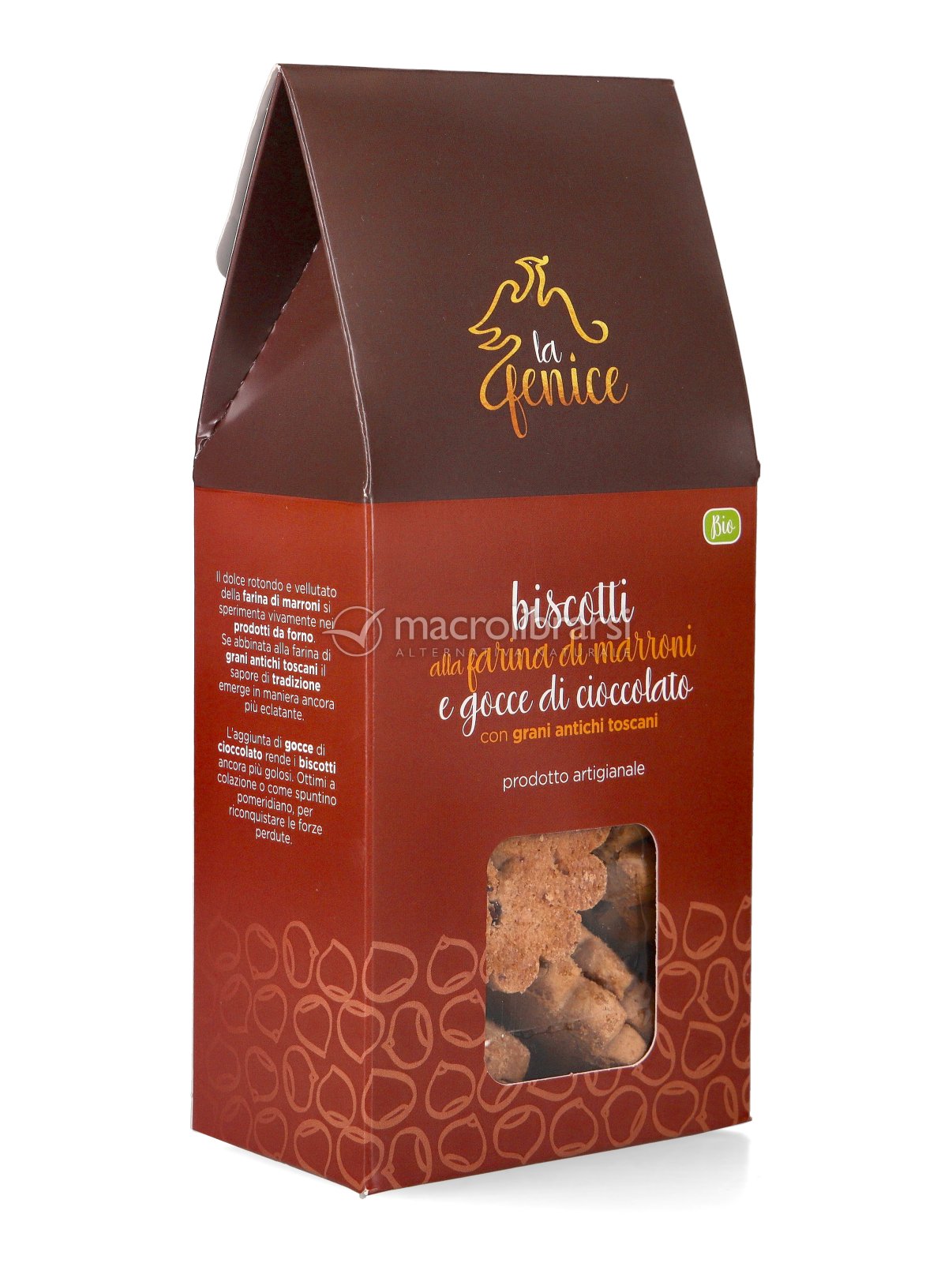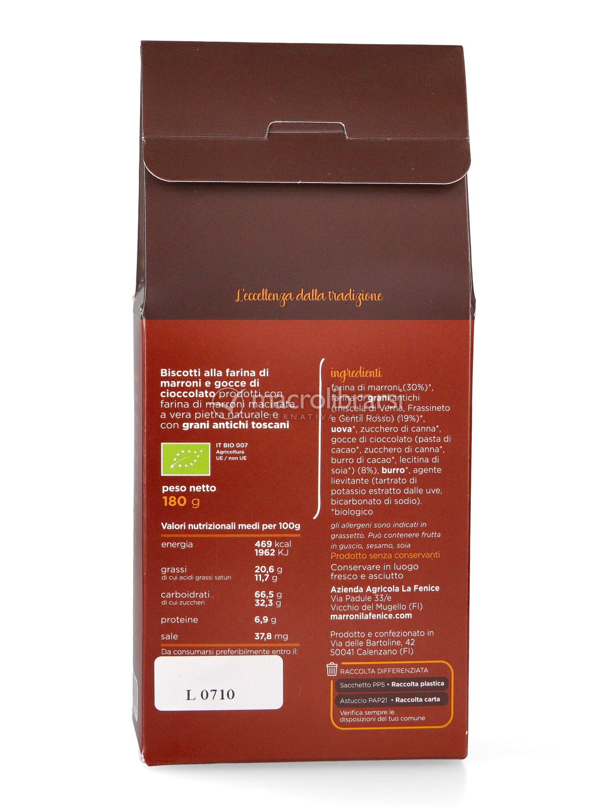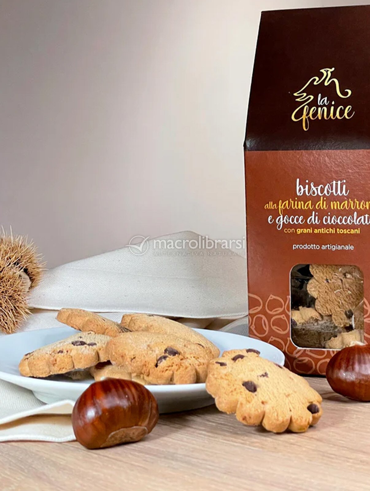 I biscotti con gocce di cioccolato dell'azienda agricola biologica La Fenice abbinano la farina di marroni a quella dei grani antichi toscani, per far emergere al meglio il sapore di una ricetta tradizionale.