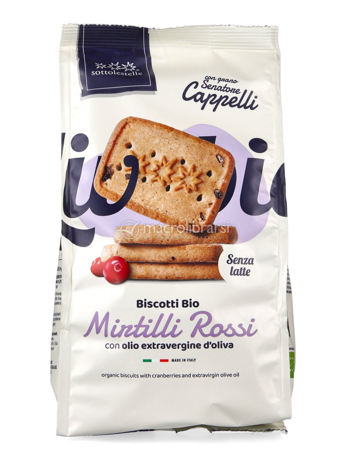 La fragranza del grano Senatore Cappelli incontra la dolce vivacità dei mirtilli rossi in un biscotto genuino e semplice, preparato con olio extravergine d’oliva, senza latte né uova.