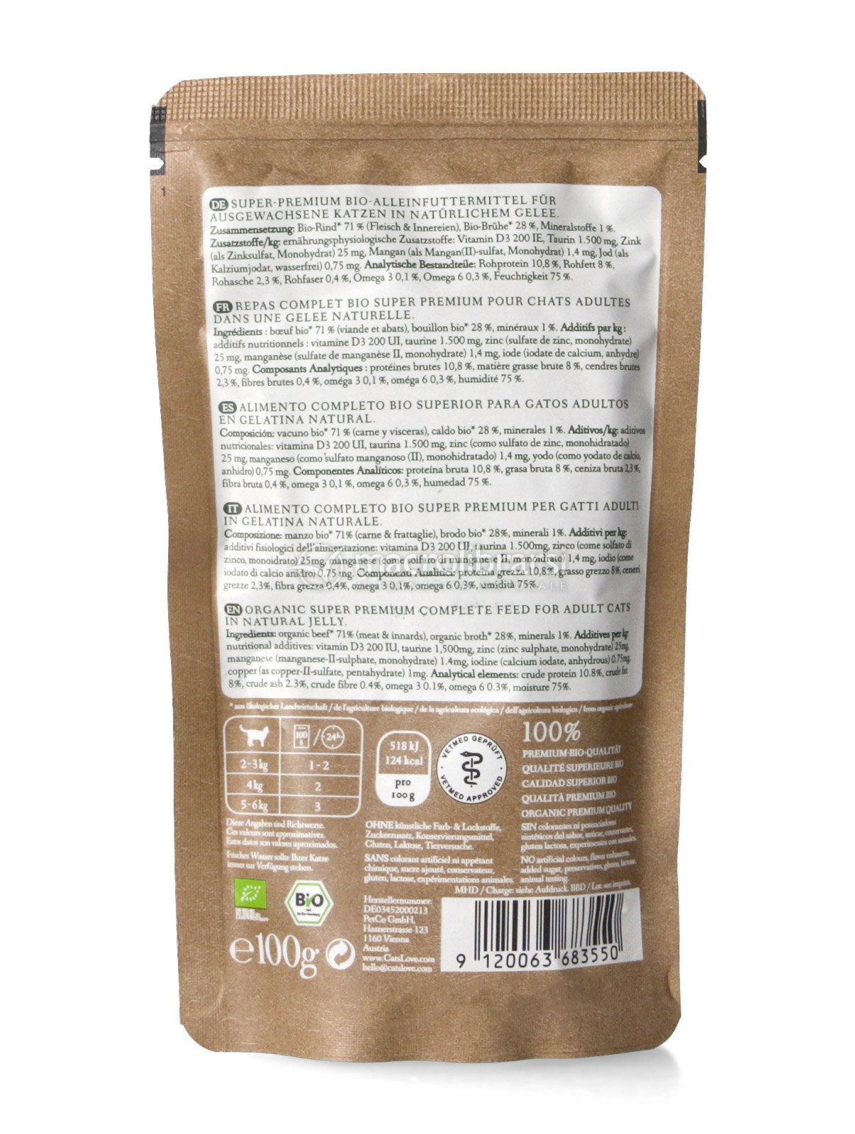 Bocconcini di manzo bio in gelatina naturale, un cibo umido completo di altissima qualità adatto anche ai gatti adulti più esigenti.