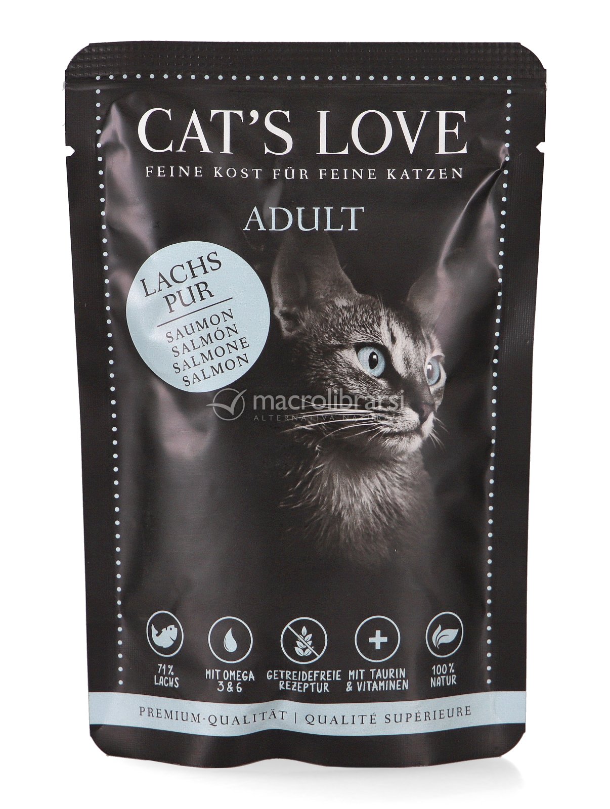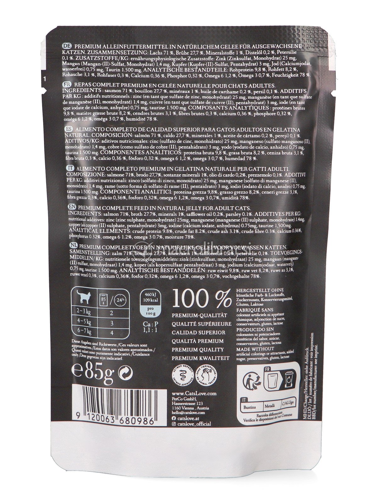 La mia micina mangia tutti i prodotti della Cat's Love, in fase di svezzamento era arrivata a mangiare 4 bustine al giorno, poi ha iniziato a preferire secco ed è cresciuta ed adesso a fatica finisce una bustina al giorno. Ma con questo gusto, non c'è stato verso, piuttosto non mangia tutto il giorno, non le piace proprio, è un peccato, perché è difficile trovare un salmone in commercio a cui non è stato aggiunto del colorante arancione (se va bene carotene, altrimenti qualcosa di chimico) per farlo assomigliare al fratello salmone selvaggio, gli ingredienti sono proprio ottimi.
