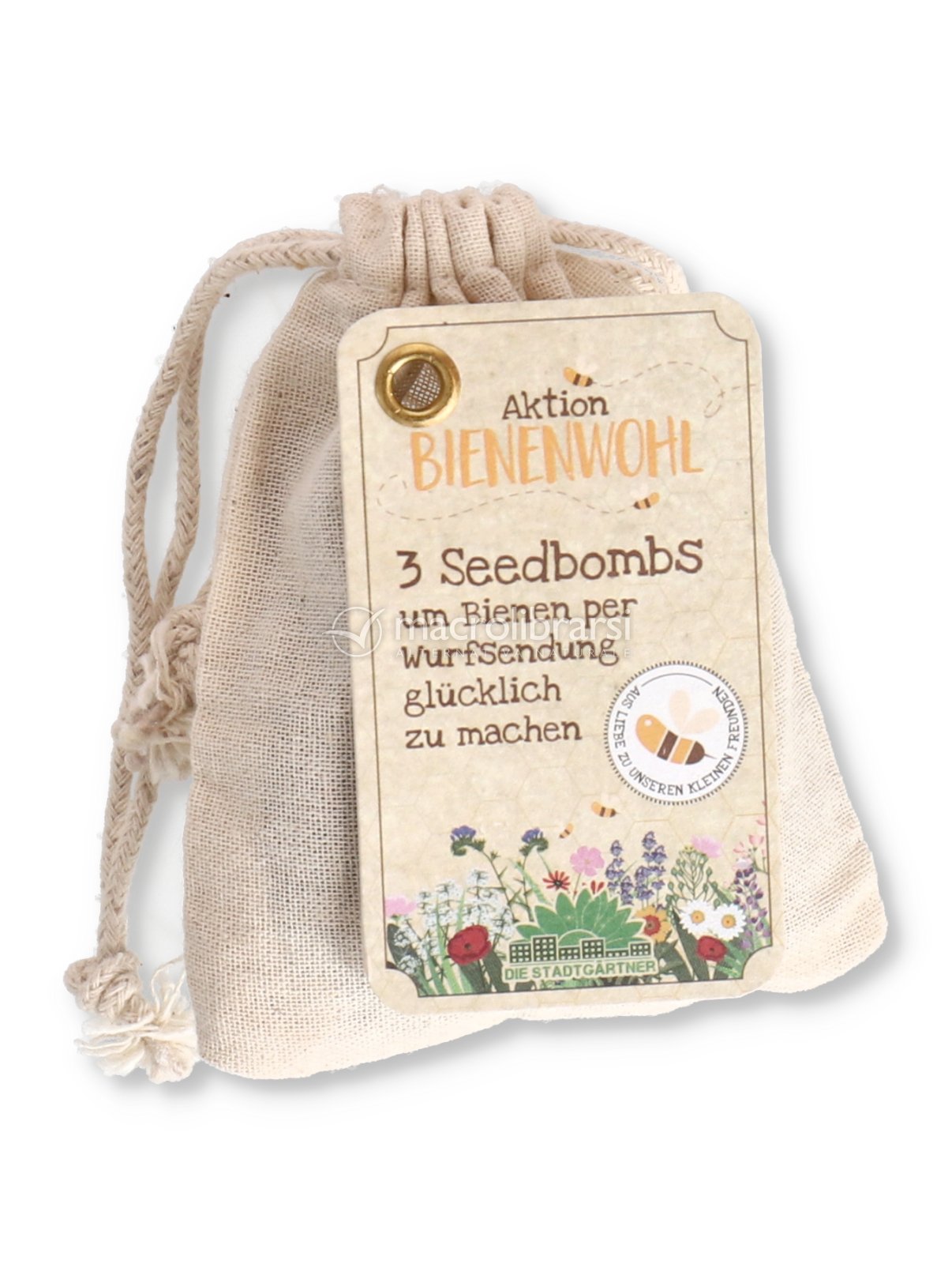 Ogni sacchetto di iuta contiene 3 bombe di semi, costituite da terra, argilla e semi adatti alle api.