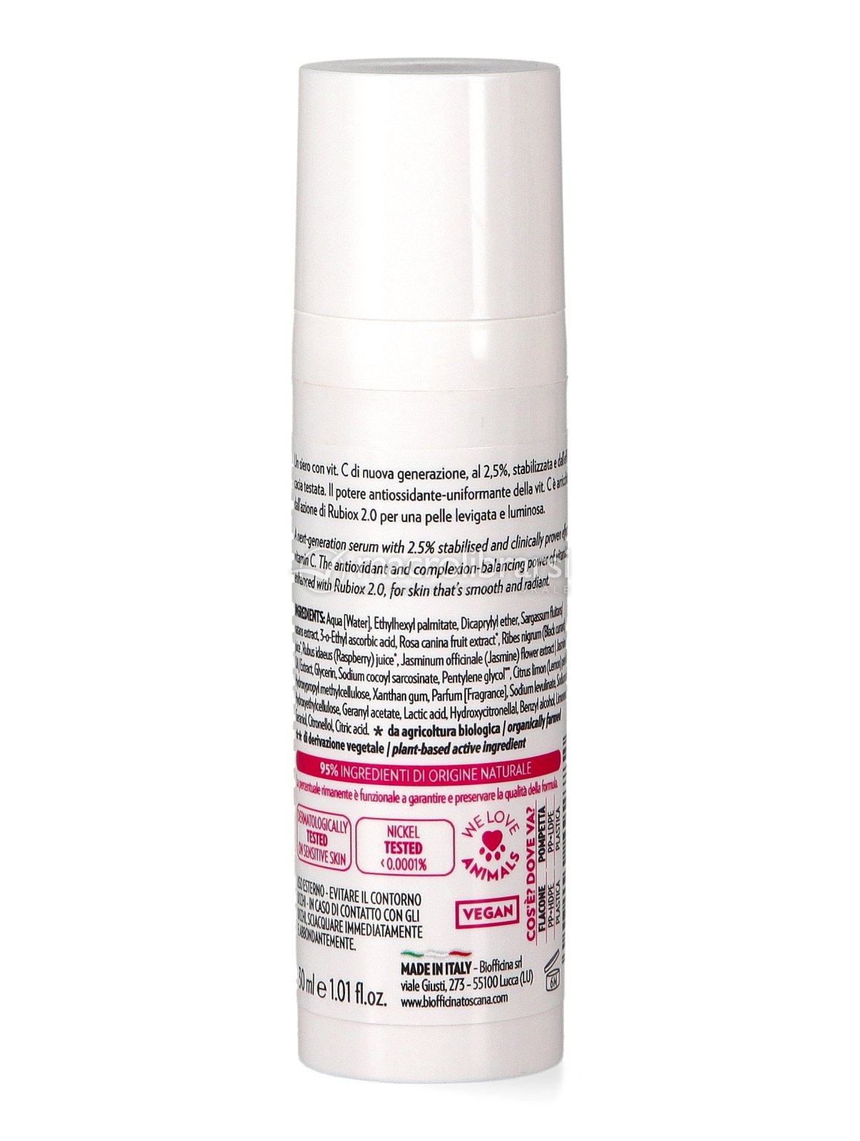 Il suo potere antiossidante e uniformante è poi arricchito da Rubiox® 2.0, un bioliquefatto esclusivo da rosa canina naturalmente ricca di vitamina C e frutti rossi bio toscani con funzione protettiva.
