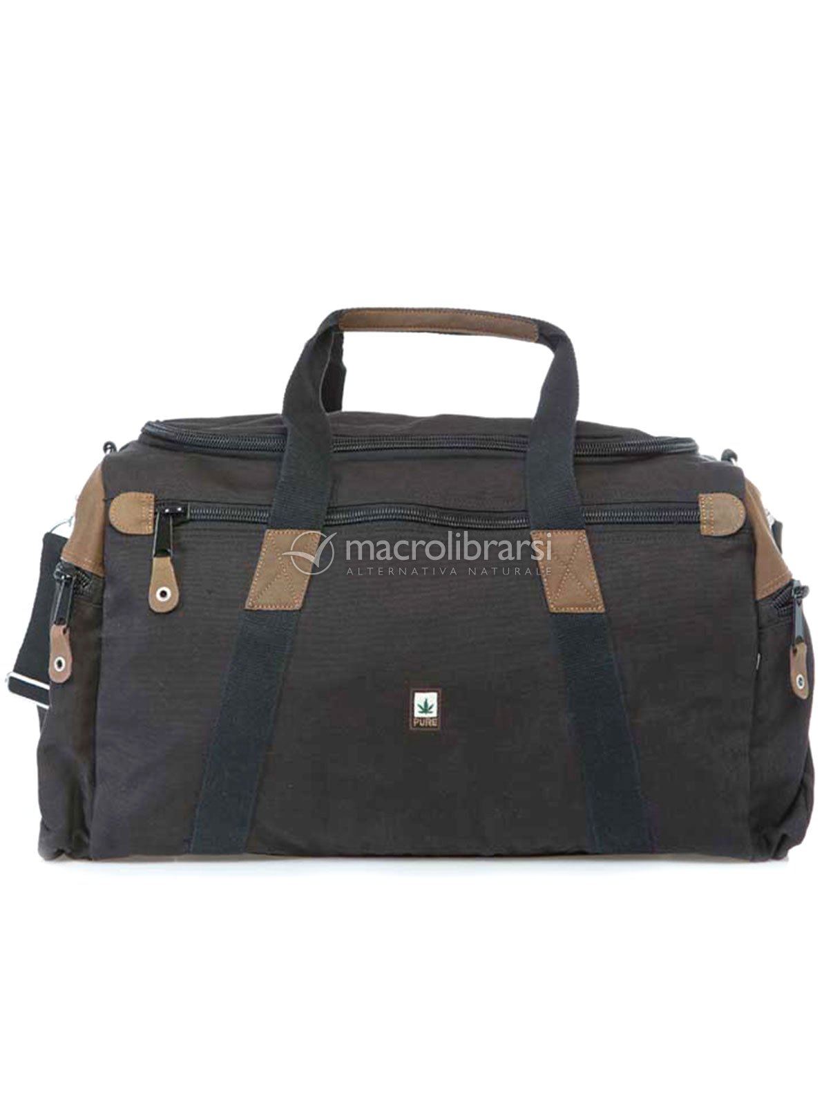 All’interno una piastra contribuisce a mantenere la borsa ben strutturata, mentre il fondo esterno è rinforzato con strisce di cuoio e piedini in metallo per una maggiore durata. Realizzata in 55% canapa e 45% cotone biologico, con inserti in cuoio, è perfetta per viaggi, palestra e weekend fuori porta.