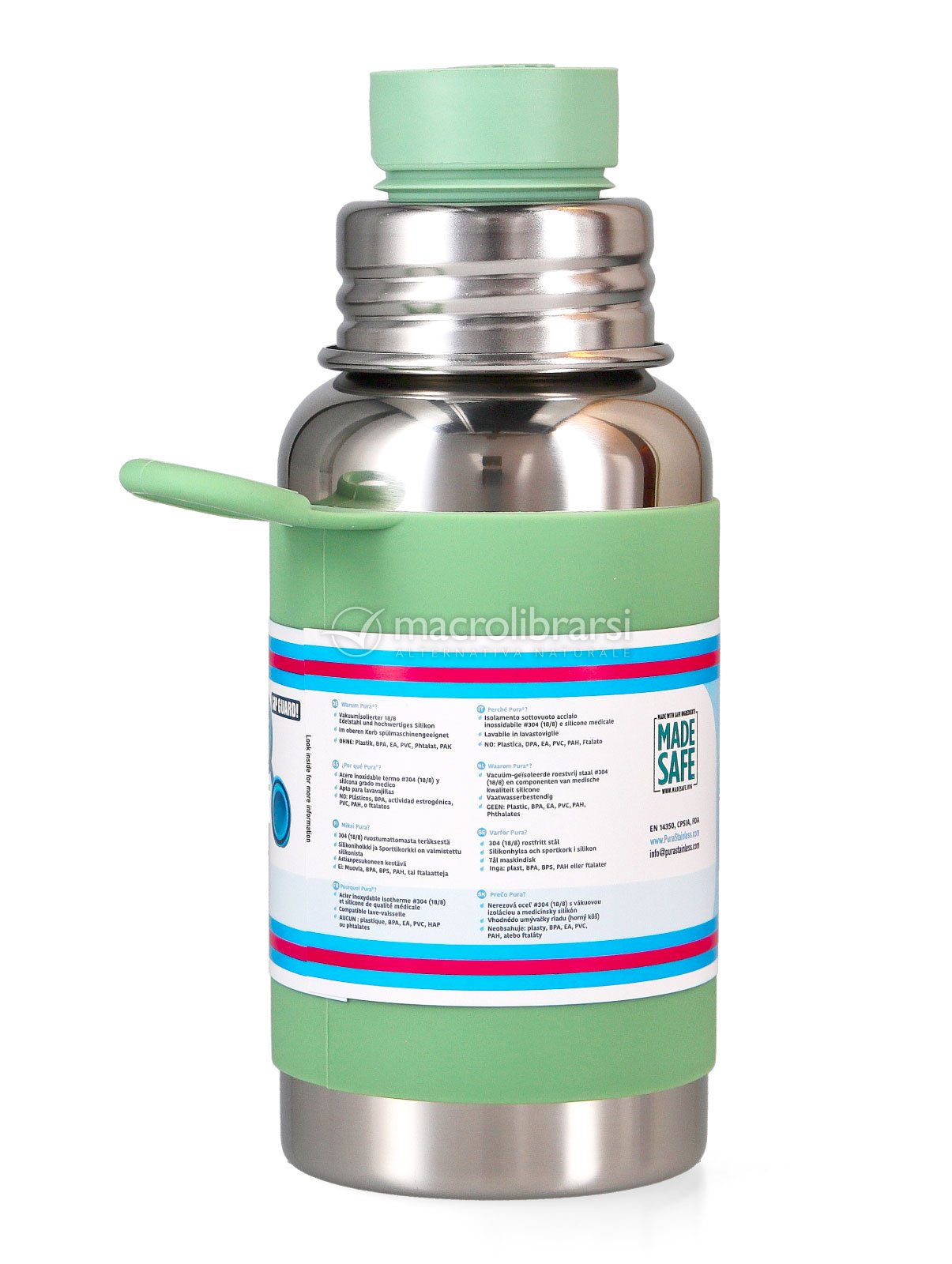 Bottiglia in acciaio inossidabile, senza plastica e derivati del petrolio, quindi sicura, igienica, resistente e leggera. Può contenere fino a 550 ml di liquido.
