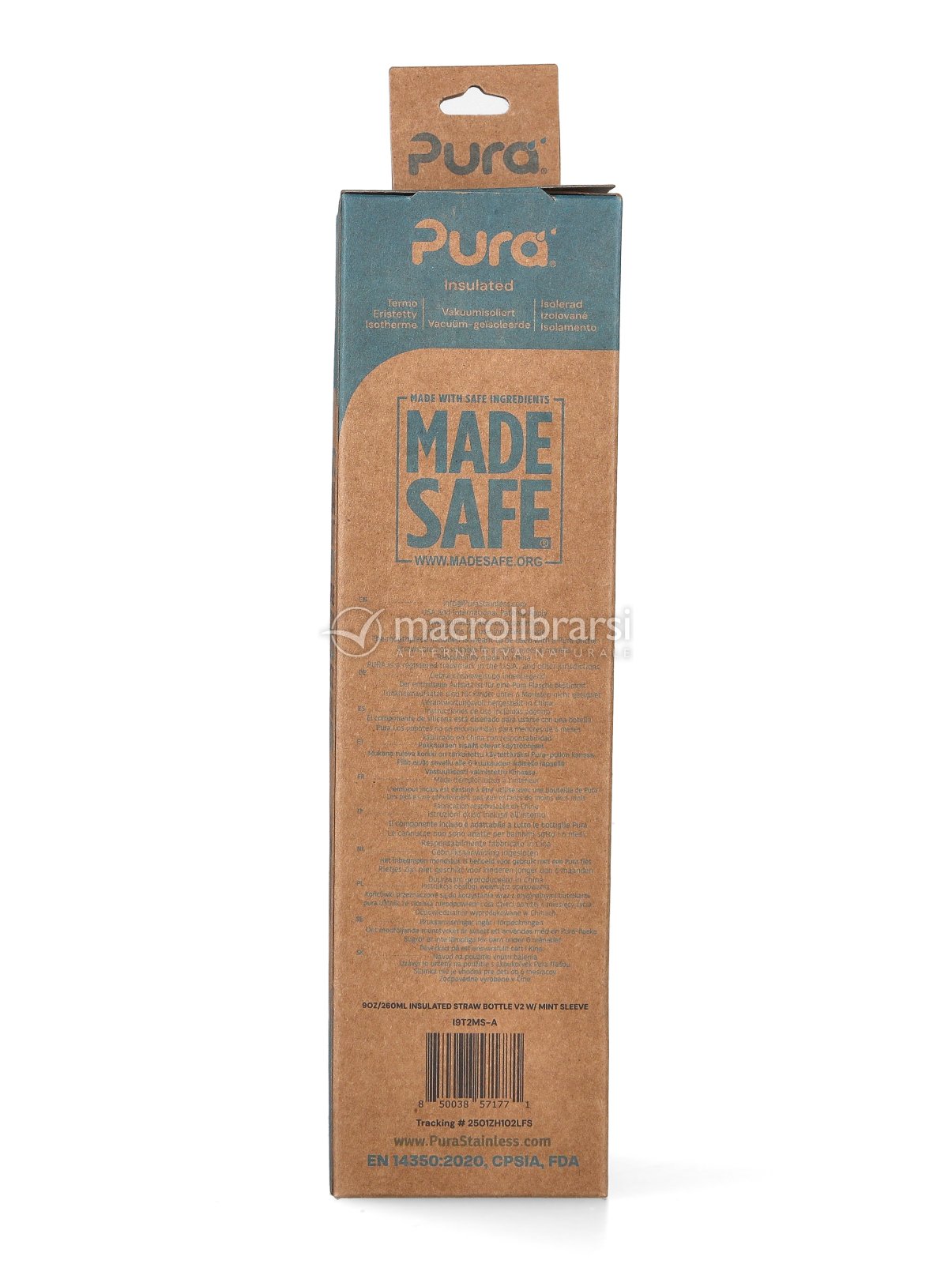Bottiglia termica in acciaio inossidabile, senza plastica e altri derivati del petrolio, quindi sicura, igienica, resistente e leggera. Può contenere fino a 260 ml di liquido.