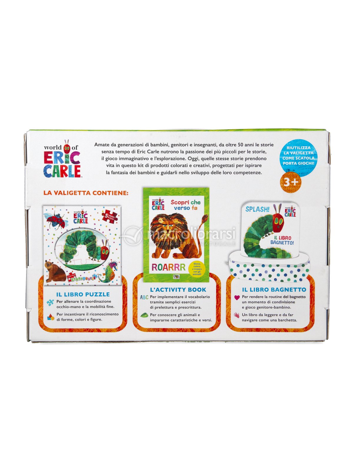 L ho comprata con lo sconto del 15 % , per il mio nipotino di 9 mesi . Il libro per il bagnetto lo può già usare , è di grandezza media , con diverse pagine in cui si vedono diversi animali ( pesci , piovre , rane , foche , coccodrilli , paperelle ) . C e una barchetta da gonfiare , sulla quale si appoggia il libro quando si vuole mettere in acqua . Nella valigetta c e anche un grande libro da disegno , con sticker , cartoncini da ritagliare e costruire , e un altro blocco con 5 puzzle abbastanza grandi . Un vero regalone .