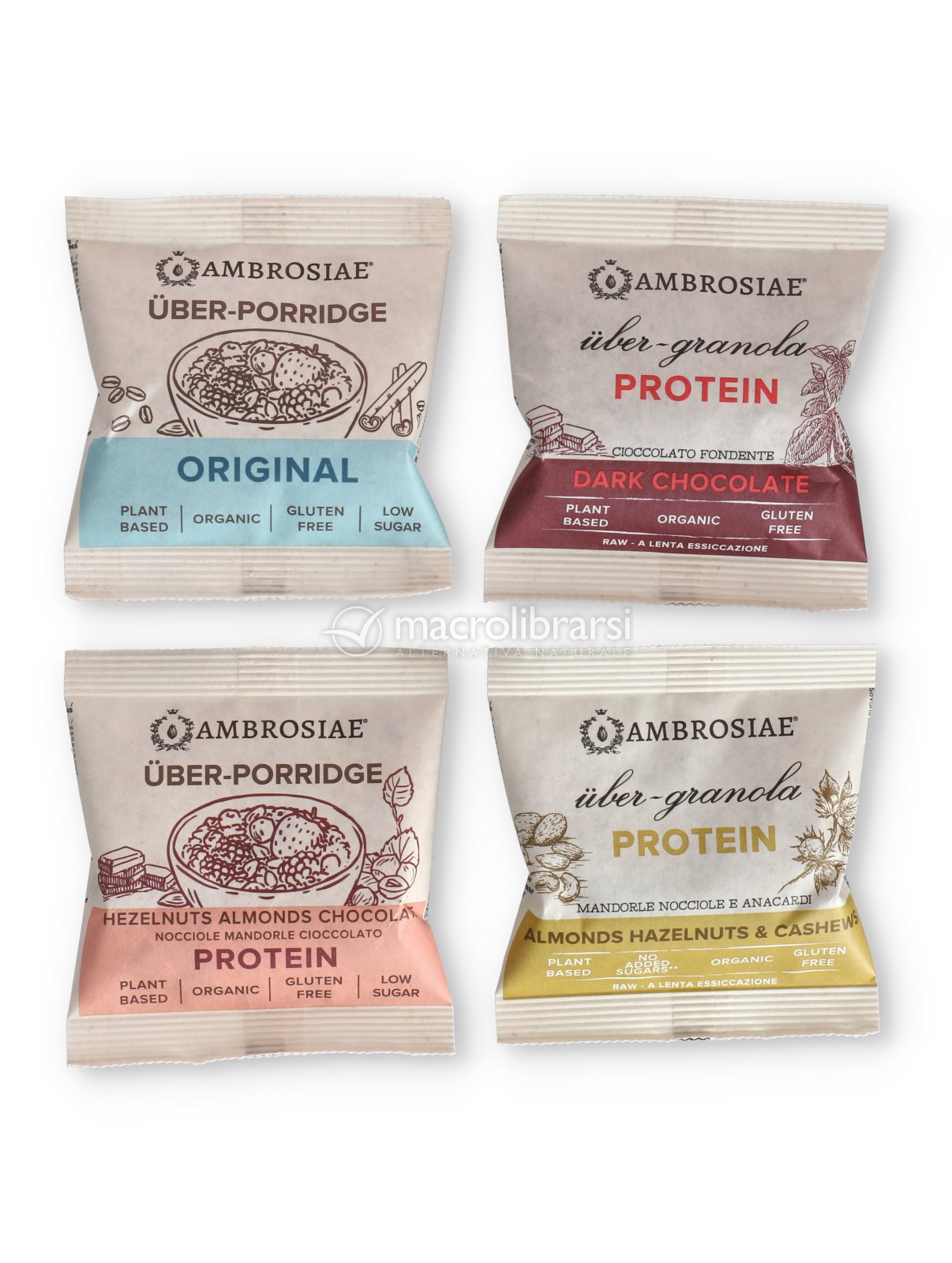 - ÜberGranola Proteica Cioccolato Fondente (45 g): Mix di cereali croccanti proteico bio con cioccolato fondente e fiocchi di avena senza glutine.