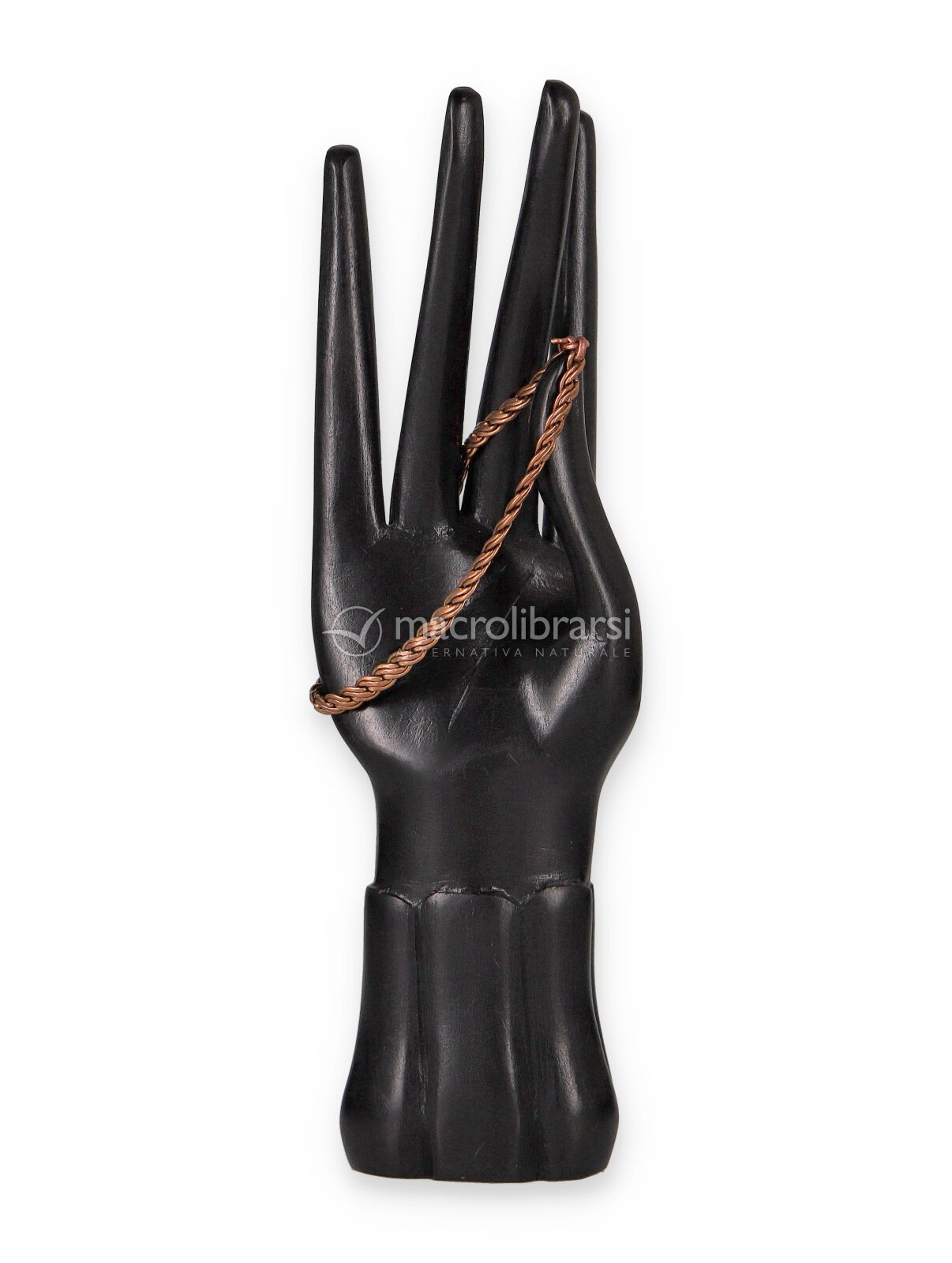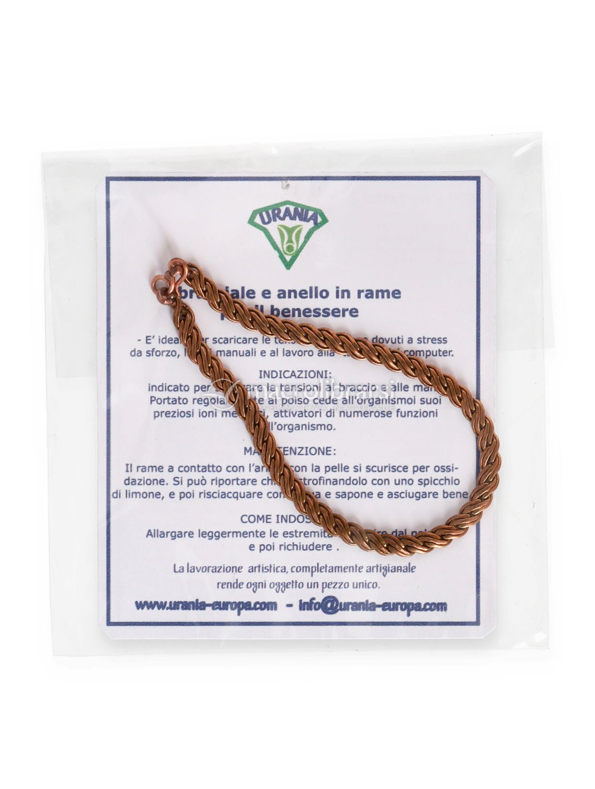 Il rame può scurirsi nel tempo a contatto con aria e pelle: è un processo naturale. Per ravvivarne la lucentezza, strofinare con uno spicchio di limone, risciacquare con acqua e sapone e asciugare accuratamente.