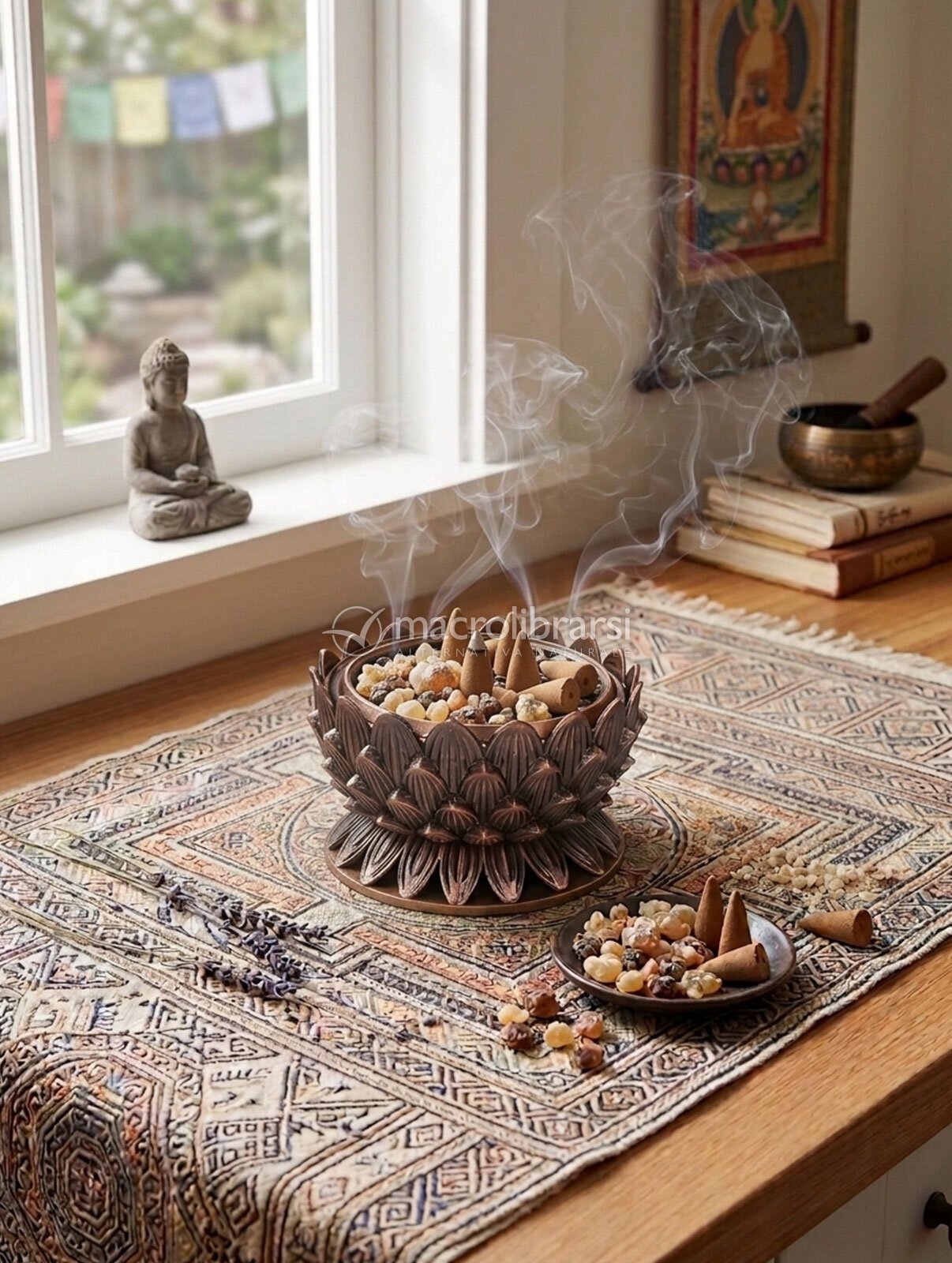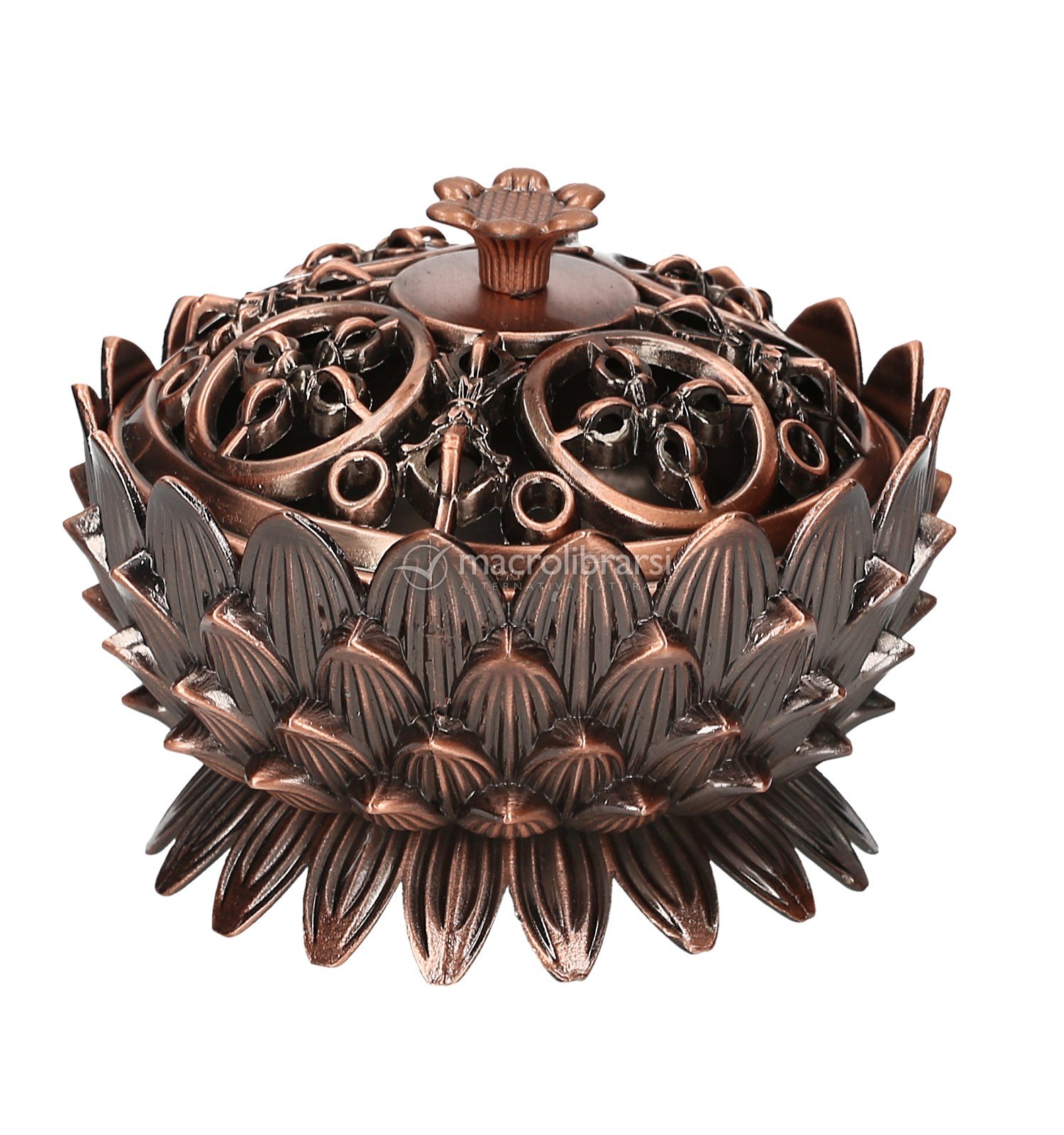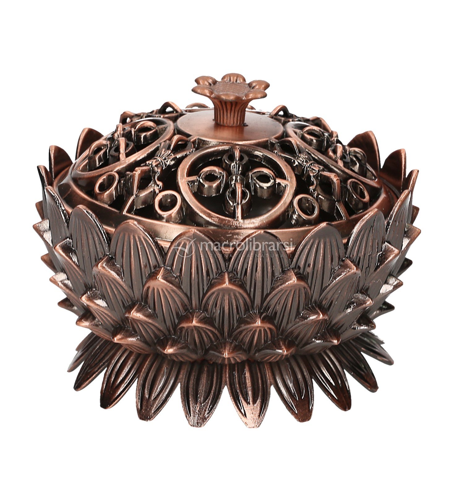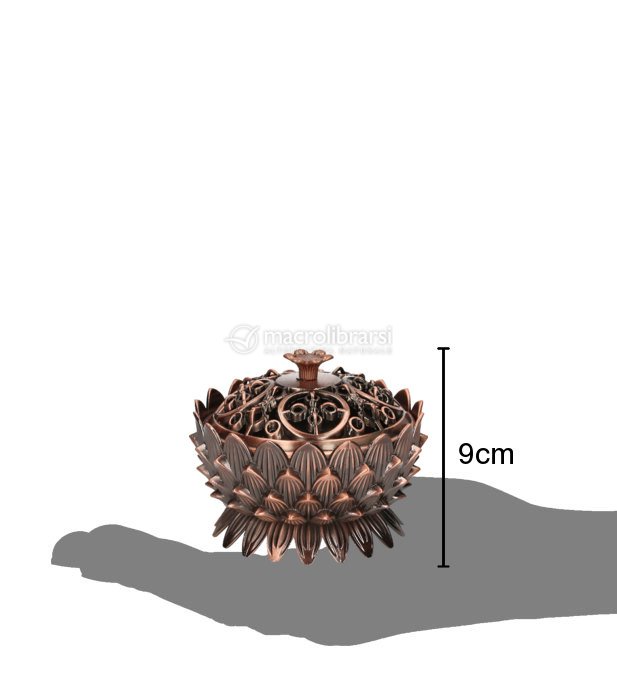 Brucia resine e incensi in coni color bronzo, realizzato nella classica forma del Fiore di Loto e arricchito da eleganti intarsi decorativi. Il coperchio è impreziosito dal simbolo del Dorje, dettaglio che richiama la tradizione spirituale orientale.