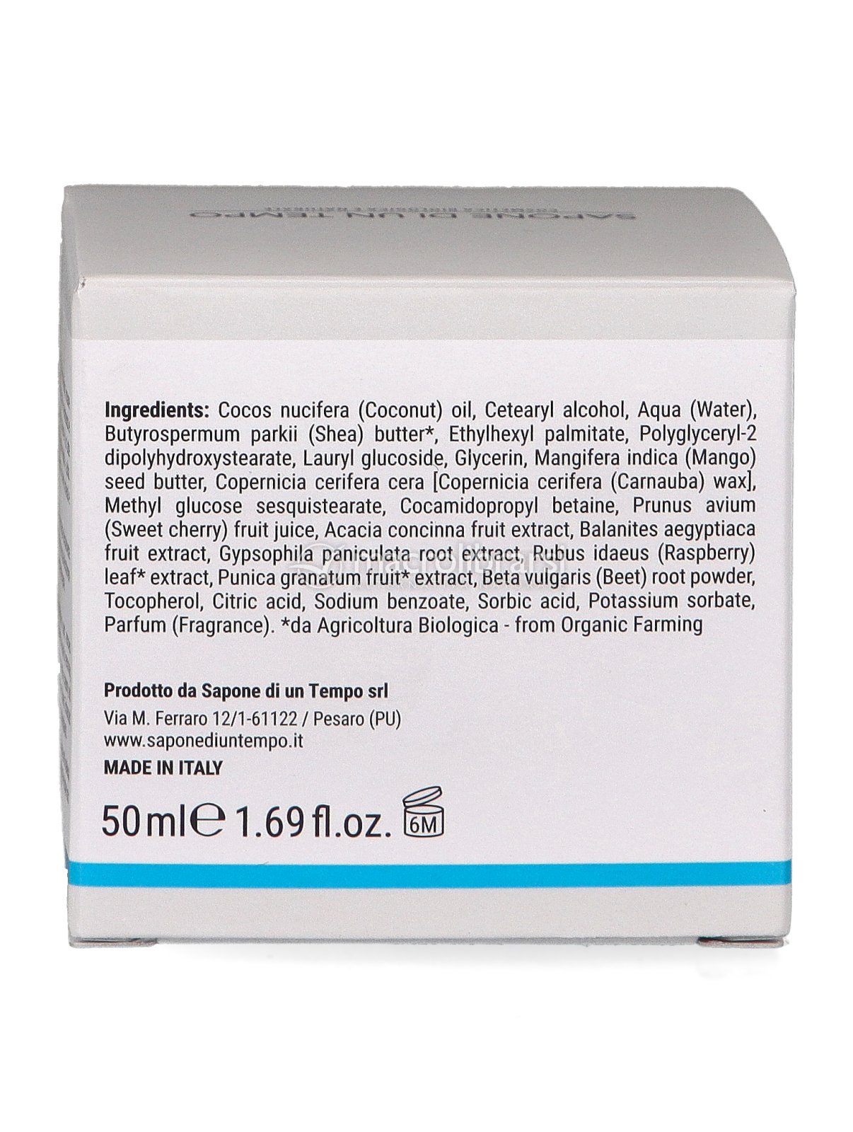 Arricchito con succo di Ciliegia italiano, ricco di vitamine, minerali e antiossidanti, a contatto con l'acqua la sua texture burrosa, morbida e delicata, si trasforma in un latte detergente cremoso e nutriente che lascia la pelle vellutata e pulita.